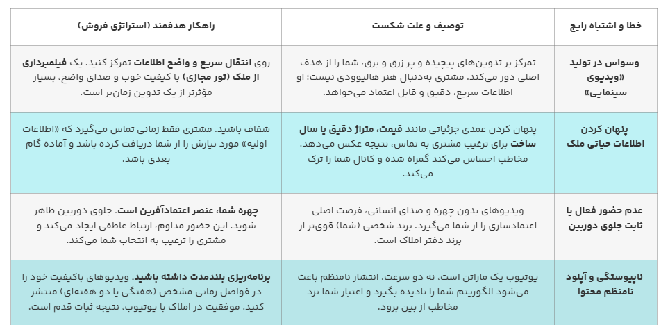 اگر در حال ساخت کانال یوتیوب املاک هستید اما تماسی دریافت نمیکنید، احتمالاً در حال ارتکاب یکی از این خطاهای رایج هستید. برای تضمین جذب مشتری املاک با یوتیوب، باید رویکرد خود را از «ساخت محتوا» به «فروش از طریق محتوا» تغییر دهید. در ادامه مهمترین دامهایی که مشاوران املاک در مسیر خود قرار میدهند، آمده است: