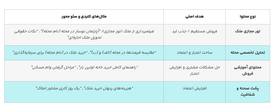 - ساخت اقتدار: انتشار محتوای تخصصی و منظم مانند تحلیل محلهها، مقایسه قیمتها و پیشبینی روند بازار، شما را به مرجع اصلی و قابل اعتماد در منطقه تبدیل میکند.