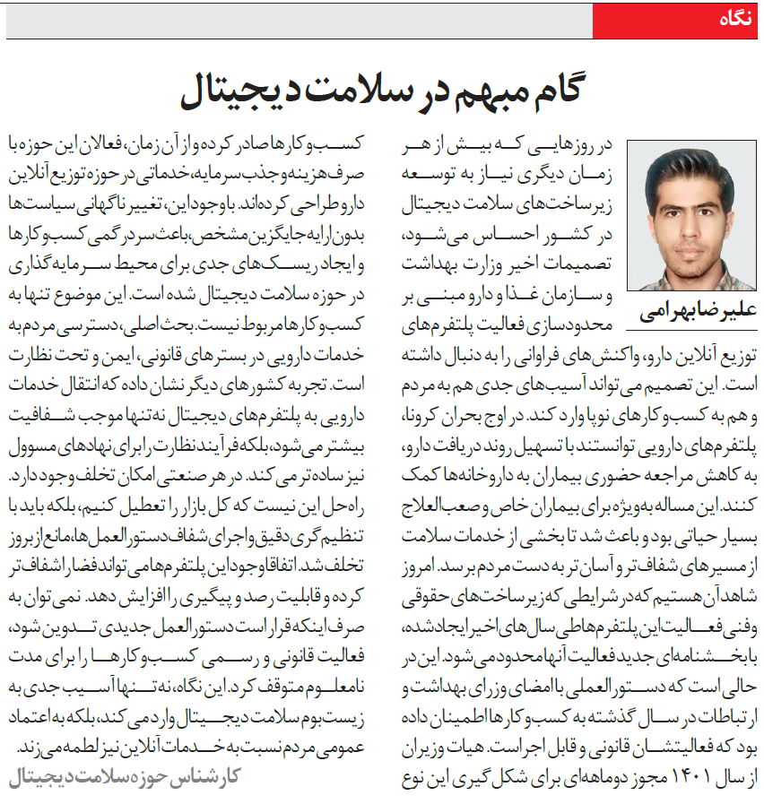 «در روزهايی كه بيش از هر زمان ديگري نياز به توسعه زيرساختهای سلامت ديجيتال در كشور احساس میشود، تصميمات اخير وزارت بهداشت و سازمان غذا و دارو مبنی بر محدودسازی فعاليت پلتفرمهای توزيع آنلاين دارو، واكنشهای فراوانی را به دنبال داشته است.