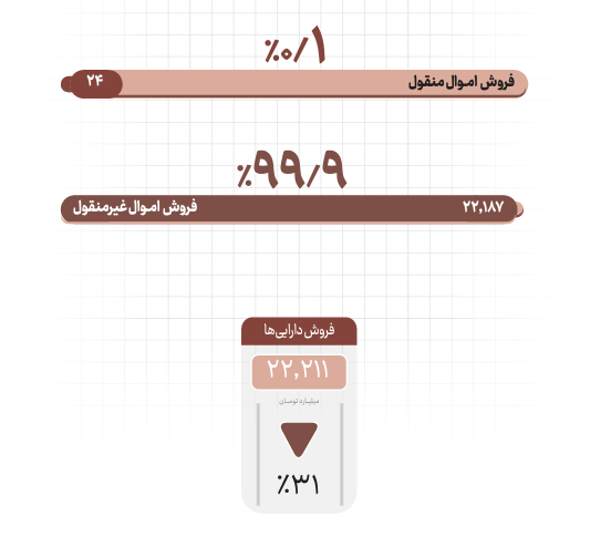 در تصویر مشاهده میکنید که اکثر مواردی که شهرداری برای تامین بودجه خود به فروش گذاشته است، اموال غیرمنقول (شامل زمین، تاسیسات، املاک و...) است. و اموال منقول (شامل ضایعات، حق برداشتها و...) سهم ناچیزی را در بر میگیرند. سوالی که مطرح میشود این است که شهرداری مشهد تا چه زمان میتواند به فروش اموال خود برای گذران ایام ادامه دهد؟