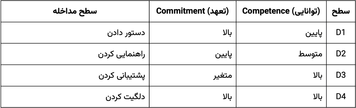 من اینجا برای سادهتر شدن مسئله، این سهتا دستهبندی رو انجام دادم. ولی اصل ماجرا الگو گرفته از مدل «رهبری موقعیتی» یا «Situational Leadership» هست که بسته به شرایط لازمه میزان مداخلهتون در تصمیمات مدیریتی (که اینجا بحث دلگیشن هست) رو مشخص کنین. توی این مدل البته تمرکز بیشتر روی افراد هست و بر اساس دوتا پارامتر Competence و Commitment میزان مداخله رو تعیین میکنه. که خب به نظرم ترکیبی از شخص و کار میتونه گزینه بهتری باشه. ولی باز همین مدل هم میتونه جهت خوبی به سطح مداخلهمون بده. خیلی خلاصه بخوام این مدل رو باز کنم، بر اساس این دوتا پارامتر، سطح آمادگی افراد رو به ۴ سطح مختلف تقسیم میکنه: