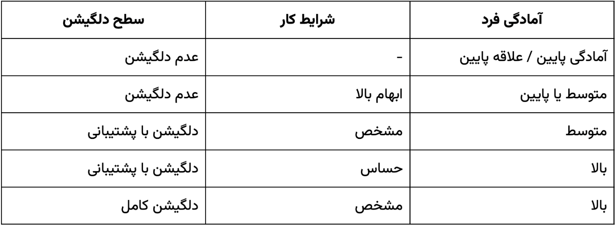 اگه این مدل و مدلی که بالا بهش اشاره کردم رو بخوایم به هم متصل کنیم، فقط با در نظر گرفتن شرایط افراد، سطوح D1 و D2 توی دسته اول جا میگیرن که هنوز شرایط برای دلگیشن فراهم نیست. سطح D3 میتونه پتانسیل قرار گرفتن توی دسته دوم، یعنی Delegation with Support رو داشته باشه و در صورتی که کاری که قصد دلگیت کردنش رو داریم شرایط لازم رو داشته باشه، میتونیم با این روش پیش بریم. سطح D4 هم پتانسیل قرار گرفتن توی دسته سوم یعنی Full Delegation رو داره و در صورتی که کاری که قصد دلگیت کردنش رو داریم شرایط لازم رو داشته باشه، میتونیم با این روش پیش بریم. التبه در صورتی که کار پیچیدگی یا محرمانگی زیادی داشته باشه، ممکنه بهتر بشه وارد دسته دوم بشیم و با پشتیبانی دلگیشن رو انجام بدیم.