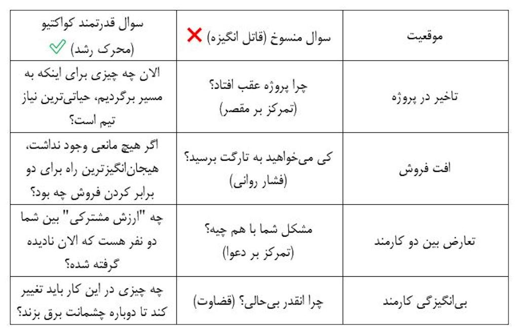 شما با سوالاتتان میتوانید یک کارمند را له کنید، یا او را به یک قهرمان تبدیل کنید. ابزارش در دهان شماست. از فردا صبح، قبل از اینکه دستوری بدهید، سه ثانیه مکث کنید و از خود بپرسید: