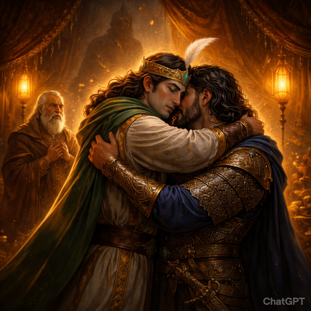 افراسیاب دست سیاوش را بگرفت و هر دو بر تخت شاهی بنشستند.