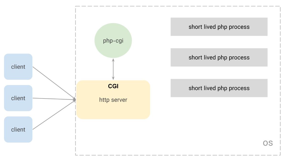 استاندارد CGI یک استاندارد قدیمی و عمومی برای اجرای برنامههای خارجی توسط وبسرورهاست. براساس این استاندارد، وبسرور میتواند برنامههایی مانند php-cgi را اجرا کند و اطلاعات مربوط به درخواست HTTP را از طریق ورودی استاندارد (stdin) به آنها منتقل کند. سپس برنامهی CGI موظف است پاسخ را از طریق خروجی استاندارد (stdout) به وبسرور برگرداند. این مکانیزم امکان ارتباط بین وبسرور و زبانهای برنامهنویسی را بدون نیاز به ماژول داخلی فراهم میسازد.