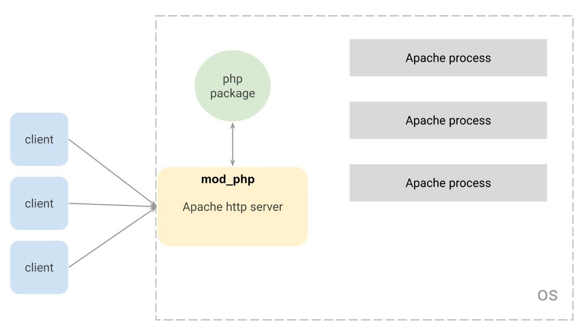 در این روش، mod_php بهتنهایی نمیتواند PHP را اجرا کند؛ بلکه تنها یک واسط است که PHP را به Apache متصل میکند. بنابراین، برای کارکرد صحیح این ماژول، باید پکیج کامل PHP روی سیستم نصب شده باشد.