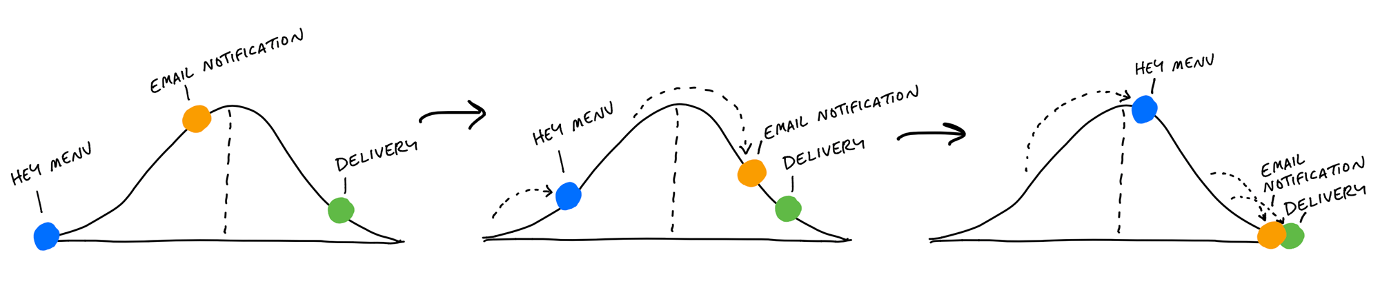 وقتی با تیم صحبت کردیم، معلوم شد که کار به خوبی پیش میرفته است. مشکل این بود که «Notify» یک چیز واحد نبود. این شامل سه بخش مختلف بود: طراحی یک ایمیل، ارسال ایمیل در Back-end، و نمایش اعلان در یک منوی درونبرنامهای (in-app menu). تیم عمدتاً کد مربوط به ارسال ایمیل را به پایان رسانده بود. طراحی ایمیل تقریباً مشخص شده بود. اما آنها کار روی نمایش درونبرنامهای را شروع نکرده بودند. نمیشد گفت که آیا «Notify» به طور کلی از تپه عبور کرده یا نه، زیرا بخشهایی از آن عبور کرده بودند و بخشهایی نه.