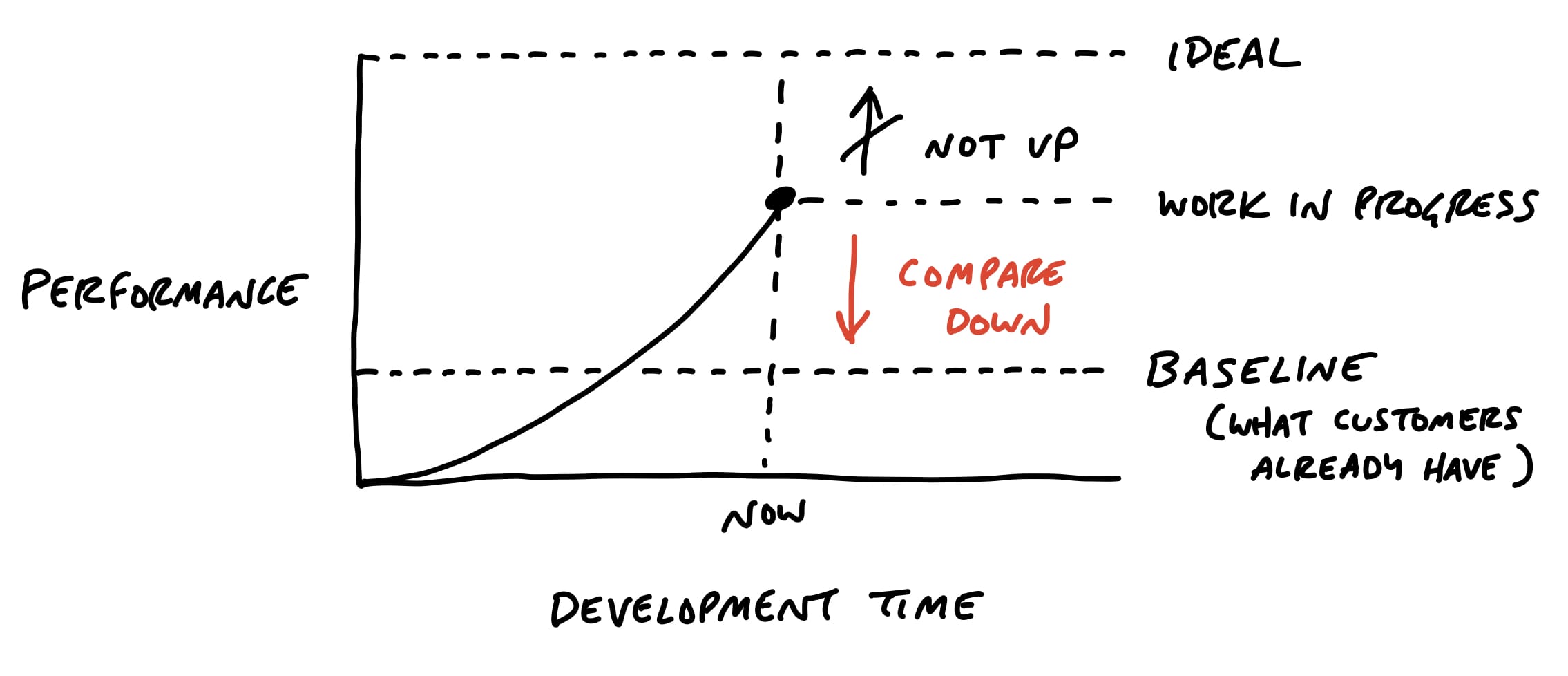 جابجایی نقطه مقایسه کمک کننده است. به جای مقایسه با ایدهآل (comparing up)، به سمت بیسلاین (baseline) مقایسه کنید—یعنی واقعیت فعلی برای مشتریان. مشتریان امروز، بدون این فیچر (feature)، چگونه این مشکل را حل میکنند؟. چه راهحل موقتی (workaround) آزاردهندهای وجود دارد که این فیچر آن را از بین میبرد؟. مشتریان چقدر دیگر باید چیزی را که کار نمیکند تحمل کنند یا منتظر راه حلی باشند، فقط به این دلیل که ما مطمئن نیستیم آیا طراحی A بهتر از طراحی B است؟.