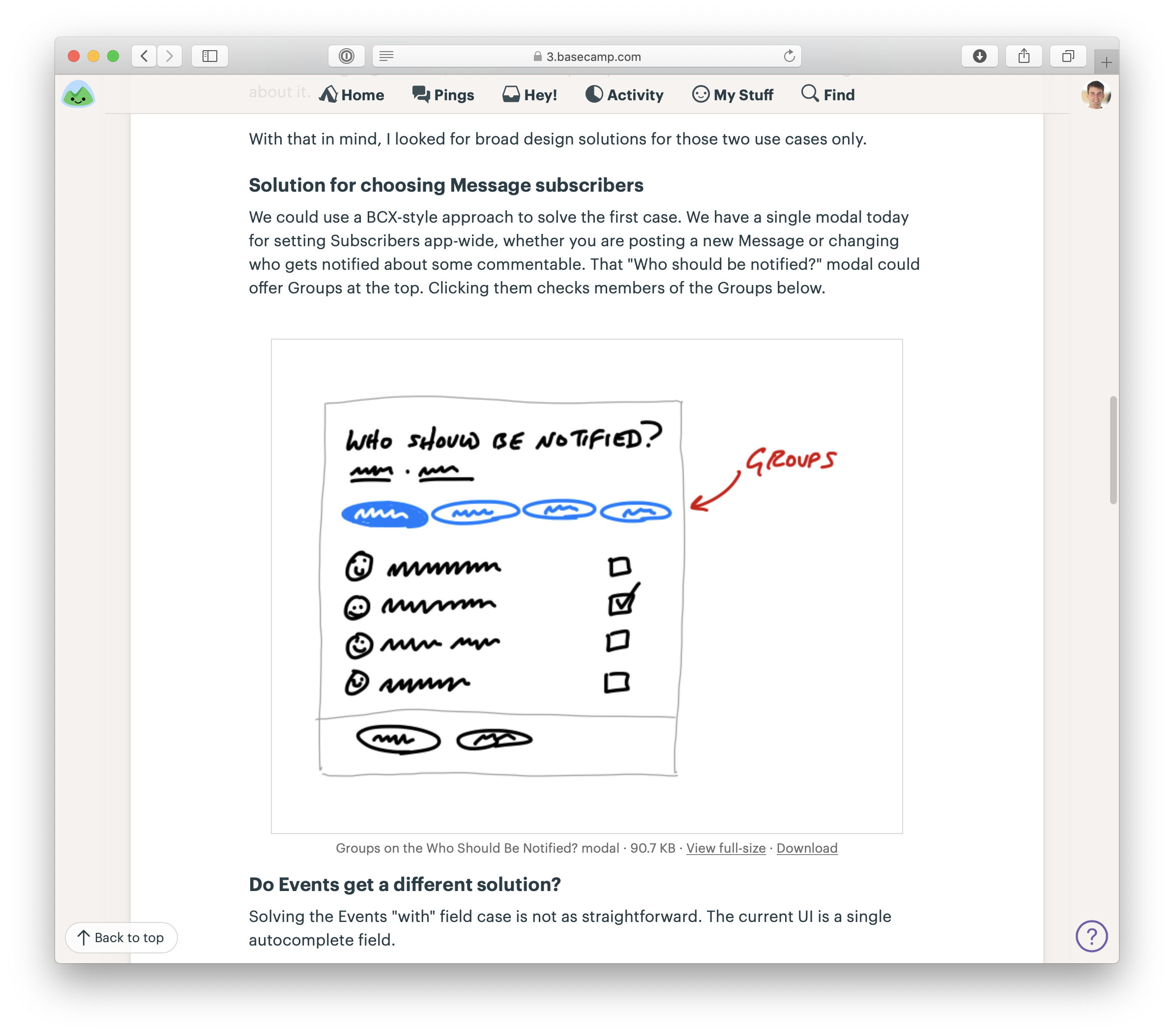 ما پیچ ها را به عنوان پیامها (Messages) در بیسکمپ ارسال میکنیم. ما یک "دسته پیام" (Message Category) با عنوان "پیچ" ایجاد کردهایم تا بتوانیم به راحتی آنها را پیدا کنیم. پیچ ها در یک "تیم" (Team) به نام "استراتژی محصول" (Product Strategy) پست میشوند که افراد حاضر در "میز تصمیمگیری" (betting table) میتوانند به آن دسترسی داشته باشند.