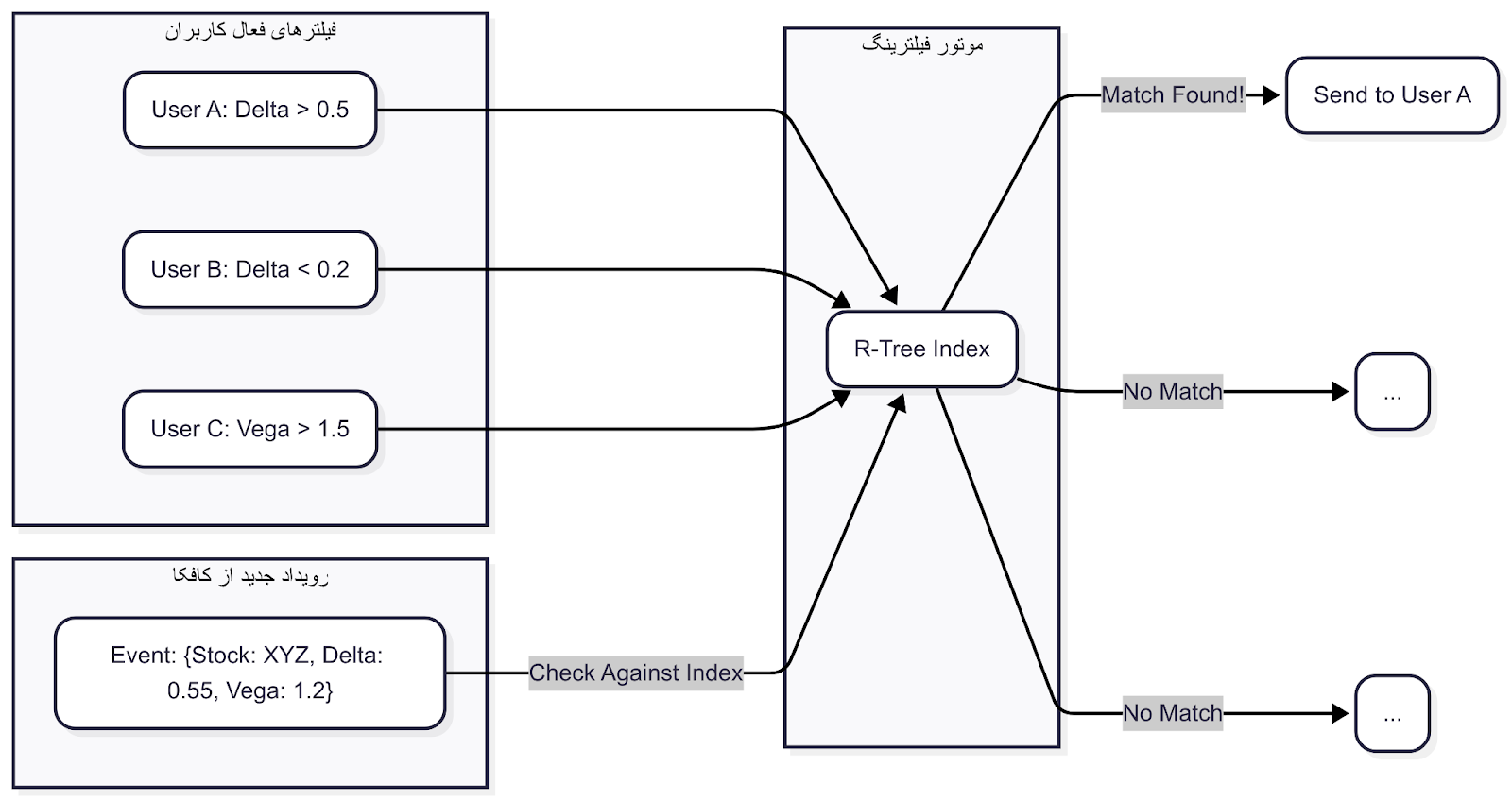 اگر با R-Tree آشنا نیستید، به زبان ساده یک ساختار داده درختیه که برای جستجوی دادههای چندبعدی (مثل جستجو در یک نقشه) فوقالعاده کارآمده. ما فیلترهای هر کاربر رو در یک R-Tree ذخیره میکردیم. وقتی یک رویداد محاسبهشده جدید از فلینک (که در کافکا بود) به دست ما میرسید، به جای اینکه اون رو برای تکتک کاربران چک کنیم، از R-Tree میپرسیدیم: "هی R-Tree، این داده به درد کدوم یکی از این فیلترها میخوره؟"