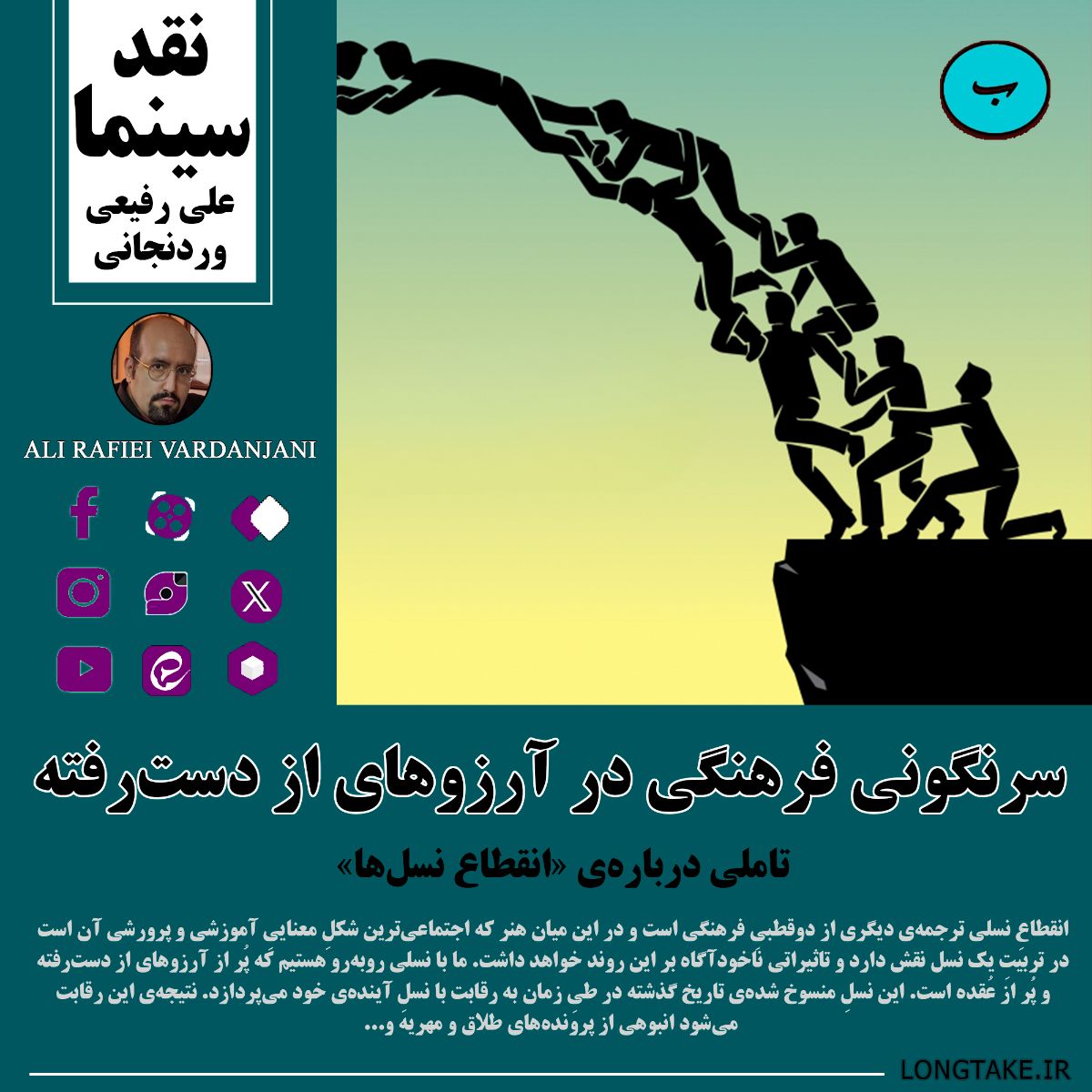 انقطاعِ نسلی ترجمهی دیگری از دوقطبیِ فرهنگی است و در این میان هنر که اجتماعیترین شکلِ معناییِ آموزشی و پرورشی آن است در تربیتِ یک نسل نقش دارد و تاثیراتی ناخودآگاه بر این روند خواهد داشت. ما با نسلی روبهرو هستیم که پُر از آرزوهای از دسترفته و پُر از عُقده است. این نسلِ منسوخ شدهی تاریخ گذشته در طیِ زمان به رقابت با نسلِ آیندهی خود میپردازد. نتیجهی این رقابت میشود انبوهی از پروندههای طلاق و مهریه و... که در این میان بینِشِ فرهنگی به سرنگونیِ ذاتِ خانواده در جامعهی ما منتج خواهد شد. این بینِش به همین تربیت و به مرورِ زمان در آرزوهای از دسترفتهی نسلهای بعدی هم دیده میشود. نسلی که به سختی پول بدست آورده و برای بدست آوردن پول، شبانهروز تلاش کرده اکنون به همان سختی پول به نسل بعدِ خود تزریق خواهد کرد و این سختی در بُردن لذّتِ روانی از تماشای بدبختیِ دیگران خلاصه میشود. این گونه از سادیسم یک مهربانی و یک مظلومنماییِ خاصّی در خودش دارد که اجازهی قضاوتِ دُرست را نیز از دیگران میگیرد. من فکر نمیکنم پدری که از فرزندش شکایت دارد و آن را پیشِ هرکسی میبرد نمیتواند همان پدری باشد که آموزههای دینی و تربیتی را به او آموخته و وظیفه و مسئولیتِ خود را بخوبی انجام داده. این نوع پدر قاطبهی نسلِ تاریخ گذشته و منسوخ شدهای است که با نابلدیِ فرهنگی و اخلاقی در «برادران لیلا» روستایی، میبینیم و...