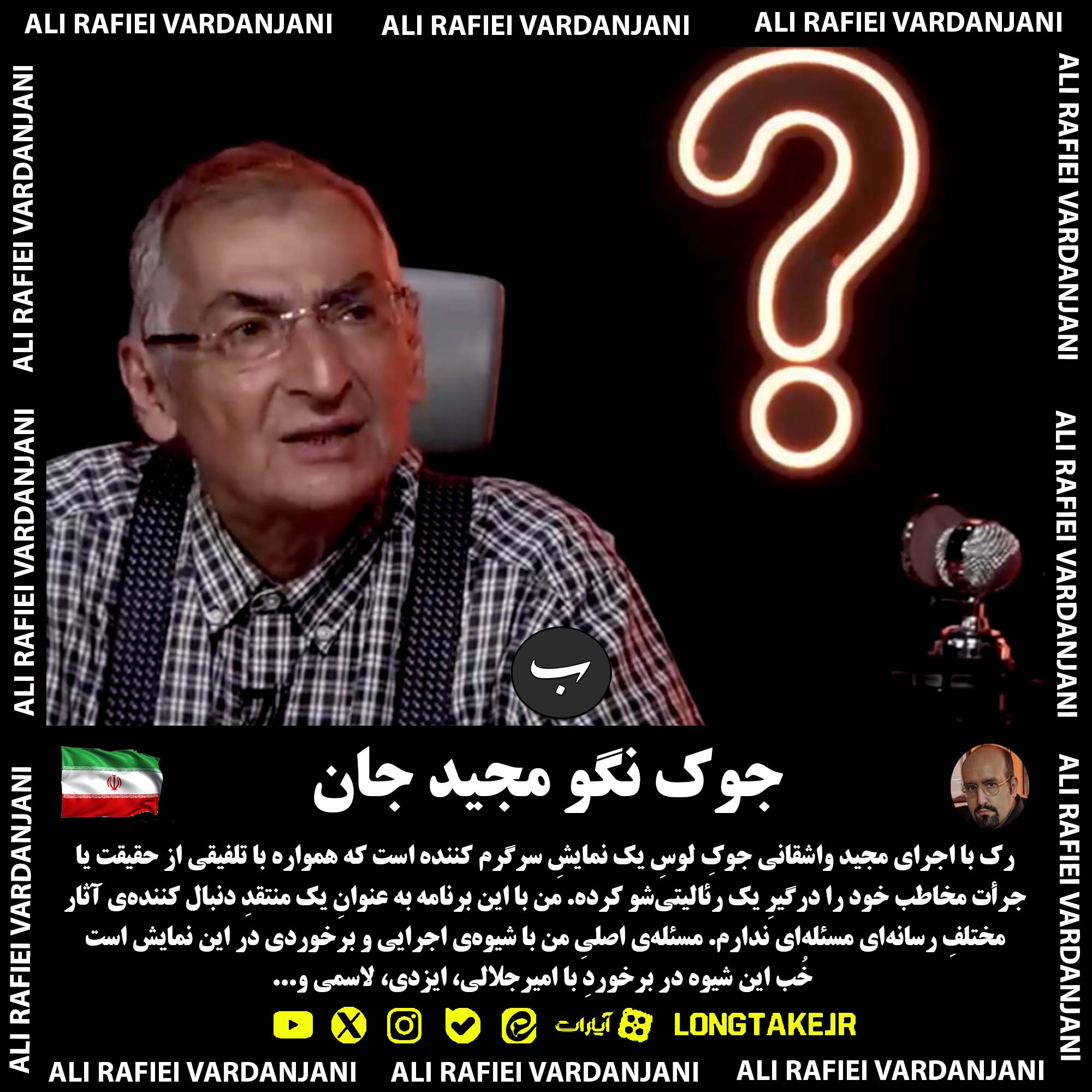 رک با اجرای مجید واشقانی جوکِ لوسِ یک نمایشِ سرگرم کننده است که همواره با تلفیقی از حقیقت یا جرأت مخاطب خود را درگیرِ یک رئالیتیشو کرده. من با این برنامه به عنوانِ یک منتقدِ دنبال کنندهی آثار مختلفِ رسانهای مسئلهای ندارم. مسئلهی اصلیِ من با شیوهی اجرایی و برخوردی در این نمایش است. خُب این شیوه در برخوردِ با امیرجلالی، ایزدی، لاسمی و... از گویشِ حاشیهساختن برای مُشتی سلبریتیِ دمِ دستی جوابگو است امّا وقتی با فردی اُپوزیسیون، که تریبونهای مختلفی از رسانههای معاند در اختیارش بوده، به نامِ صادق زیباکلام روبهرو میشویم باید شیوهی برخوردِ سیاسی – تاریخی دستور کار قرار گیرد. وجودِ این فکت که من رفتم اینستاگرام شما را چک کردم یا 10 سالی است که شما را دنبال میکنم تا حدّی که میدانم یک دوستِ مریخی دارید؛ به دردِ چُنین گفتوگوهایی نمیخورد. این فعالیتها بهتر است در اندازه حقیقتیابی در زندگیِ یک سلبریتی باقی بماند چرا که ما الآن با کسی روبهروایم که به اسرائیل حق میدهد به کشورش حمله کند و سیاستهای ایران را مانع پیشرفت میداند؛ فریب این موش مُردگیهایش هم نخوریم که گاهی در پاسخ به واشقانی سکوت میکند و...