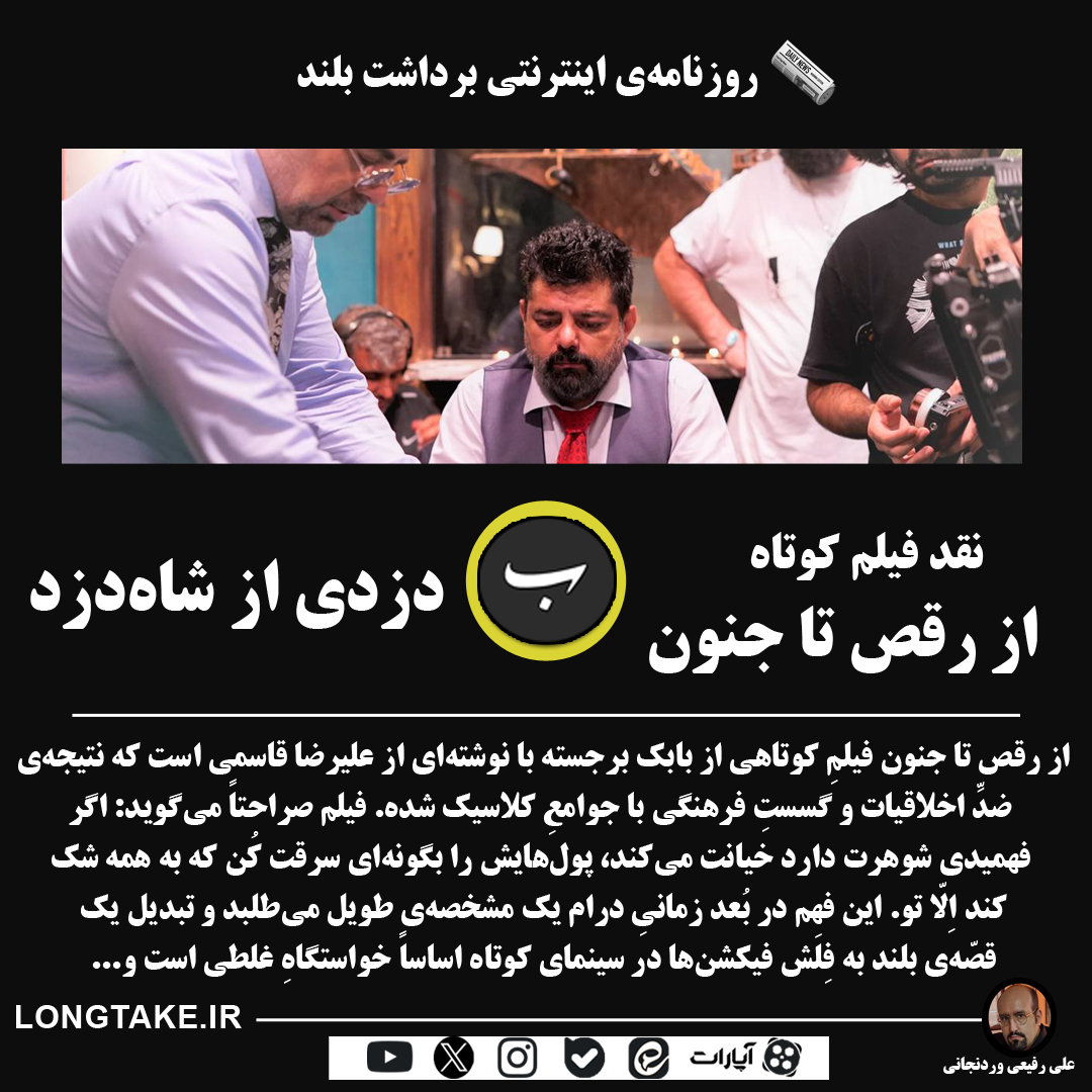 از رقص تا جنون فیلمِ کوتاهی از بابک برجسته با نوشتهای از علیرضا قاسمی است که نتیجهی ضدِّ اخلاقیات و گسستِ فرهنگی با جوامعِ کلاسیک شده. فیلم صراحتاً میگوید: اگر فهمیدی شوهرت دارد خیانت میکند، پولهایش را بگونهای سرقت کُن که به همه شک کند اِلّا تو. این فهم در بُعد زمانیِ درام یک مشخصهی طویل میطلبد و تبدیل یک قصّهی بلند به فِلَش فیکشنها در سینمای کوتاه اساساً خواستگاهِ غلطی است. بمبارانِ ضدِّ اخلاقیات و عُرفیاتِ جامعه به اندازهای غافلگیر کننده است که مُهلتِ تنفس به بیننده را برای هضمِ قاعدهی بعدی نمیدهد و از سویی حضور احمدلو و قریبیان تنها به ویترینِ اثر افزوده و به غیر از کاربردِ بیزینِسی ویژگیِ دیگری ندارد. بازیِ به شدت بدِ سامِ قریبیان نشان از عدمِ تسلطِ کارگردان در بازیگرفتنِ از بازیگر دارد. کارگردان به نوعی مرهونِ حضورِ چُنین بازیگری شده و اجمالاً فیلم را بسته. از سویی دیگر سینما نباید بر اساسِ ذهنیتِ مخاطب شکل بگیرد بلکه باید بر اساسِ ذهنیتی فراتر از تصور ایجاد گردد. دلارها گُم شده و کسی حقِّ خروج از این خانه را ندارد؛ خُب این سوراخِ بزرگ در فیلمنامه است که چرا آدمهای خائن به همسرشان شک نمیکنند و دوست دخترشان را بانی این سرقت میدانند و...