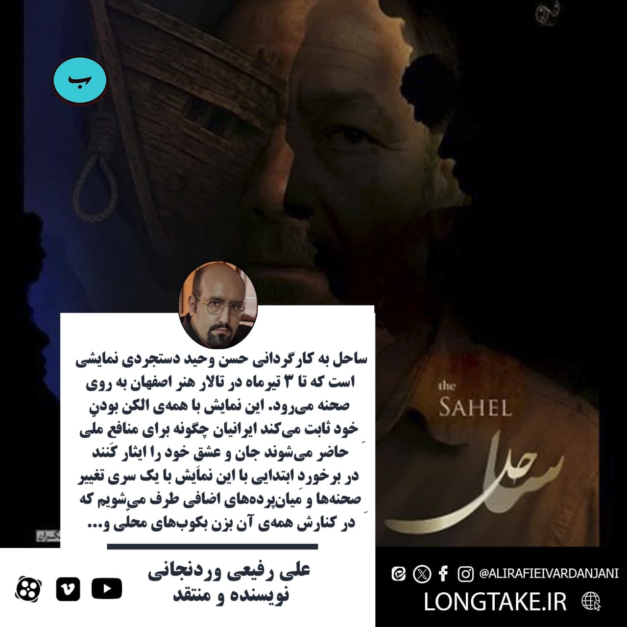 ساحل به کارگردانی حسن وحید دستجردی نمایشی است که تا 3 تیرماه در تالار هنر اصفهان به روی صحنه میرود. این نمایش با همهی الکن بودنِ خود ثابت میکند ایرانیان چگونه برای منافعِ ملّی حاضر میشوند جان و عشقِ خود را ایثار کنند. در برخوردِ ابتدایی با این نمایش با یک سری تغییرِ صحنهها و میانپردههای اضافی طرف میشویم که در کنارش همهی آن بزن بکوبهای محلّی را زائد کرده. این نمایش میتواند در یک مونولوگ خلاصه شود!: منِ ساحل بیست سال خود را به نابینایی زدم و دیدم که برادرم از پشت به عشقم خنجر زد یا دیدم آن کلنل چگونه سرِ مردم و پیرِ معتمدشان کُلاه گذاشت. نمایش یک غمِ بزرگ بر دلِ من نشاند. اگرچه شبِ اولش بود و این نباید برای مخاطب مهم باشد که من و امثالِ من راجع به آن چه مینویسم، امّا استقبالِ اندکِ تماشاگران از آن یک بیلطفیِ بزرگ است. این نمایش نامِ خلیج فارس را به دوش میکشد. از بندر و مردمِ زجر دیدهاش میگوید. برای ایران و منافعش در حرکت است و آن هنگام مردم باید پای کارِ چُنین نمایشهایی ایستاده برای عواملش دست بزنند تا غربیها برای قُبحشکنیها و بد گُفتن از جامعهی ایرانی 13 دقیقه ایستاده کسی را تشویق نکنند و...
