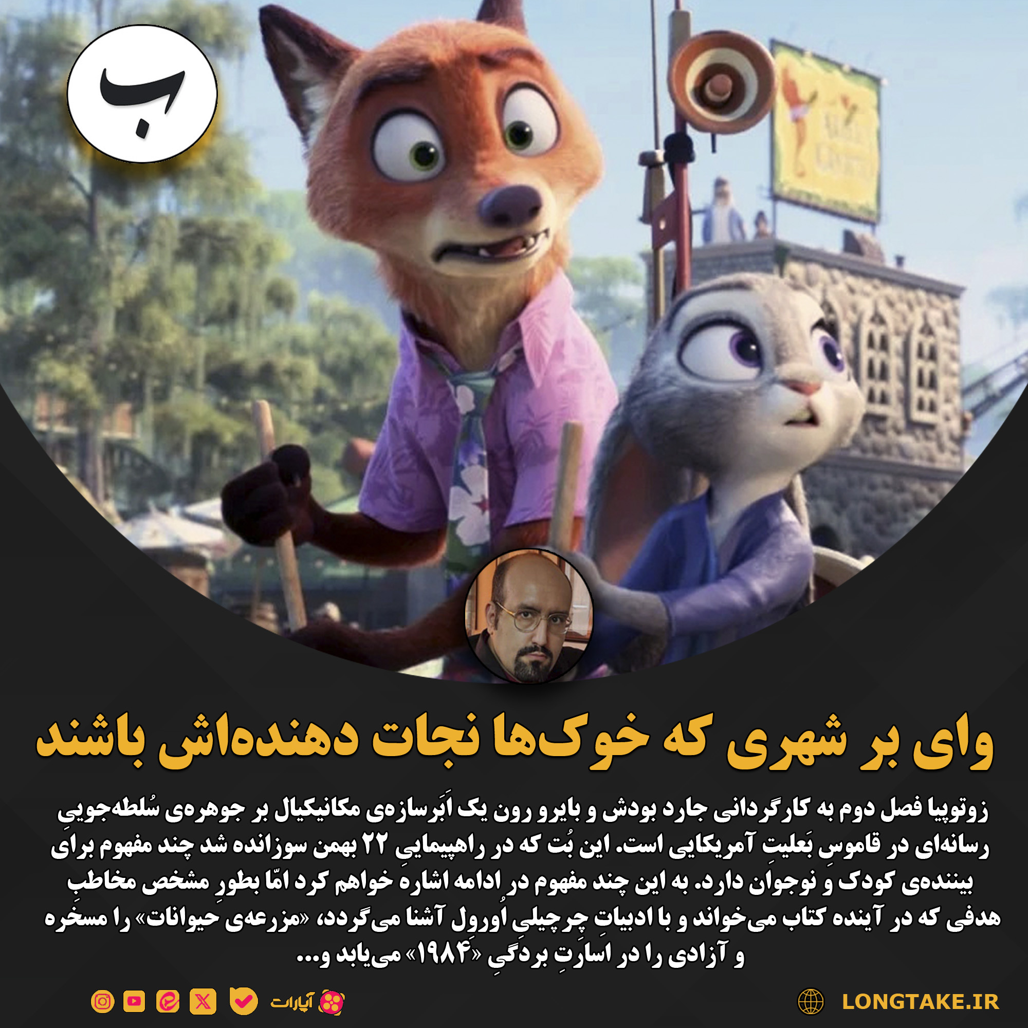 زوتوپیا فصل دوم به کارگردانی جارد بوش و بایرو هاوارد یک اَبَرسازهی مکانیکیال بر جوهرهی سُلطهجوییِ رسانهای در قاموسِ بَعلیتِ آمریکایی است. این بُت که در راهپیماییِ 22 بهمن سوزانده شد چند مفهوم برای بینندهی کودک و نوجوان دارد. به این چند مفهوم در ادامه اشاره خواهم کرد امّا بطورِ مشخص مخاطبِ هدفی که در آینده کتاب میخواند و با ادبیاتِ چِرچیلیِ اُوروِل آشنا میگردد، «مزرعهی حیوانات» را مسخره و آزادی را در اسارتِ بردگیِ «1984» مییابد. از نظر فلسفی نیز به گُفتهی هِگِل ارتباطِ میان ارباب و خادم مانندِ ارتباط میانِ سوژه و زبان است. این طور استنباط میشود که انسان در پوششهای مُختلفِ ذهنی شکلی فرا موجودی از تسلط بر دیگران خیال خواهد کرد. جهانی که به یک خرگوش حق میدهد با روباه دوست باشد چرا که خوکها از دیگر حیوانات برابرترند و براساسِ تفکر انسانی ماجراجویی میکند، دقیقاً همین دنیایی است که ترامپِ خوک صفت در آن احساس میکند مالکاش است. یک جاهایی به مارکی دوساد برای آفرینشی به نامِ مکتبِ لیبرتین حق میدهم چرا که جریانِ پروندهی اِپْستین واقعاً یک جریانِ لذّت بُردن از دگرآزاری با قدرت است. فریبِ این جهان را با چُنین پویانماییهایی که از کودکی در ذهنِ فرزندِ من و تو میکارند که حق با خوکها است چرا که حیوانی به نجابتِ اسب کلانتر شهر است و فردین بازی در میآورد، را نخورید چرا که من باور دارم این طمع نیست که دنیایی را با قدرتِ مادّیات تصاحب کردن این خودِ لیبِرتِنیسم است و...