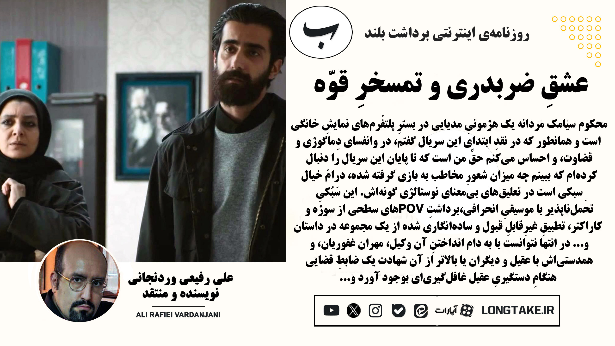 محکوم سیامک مردانه یک هژمونیِ مدیایی در بسترِ پلتفُرمهای نمایشِ خانگی است و همانطور که در نقدِ ابتدای این سریال گفتم، در وانفسای دِماگوژی و قضاوت، و احساس میکنم حقِّ من است که تا پایان این سریال را دنبال کردهام که ببینم چه میزان شعورِ مخاطب به بازی گرفته شده، درامْ خیالِ سبکی است در تعلیقهای بیمعنای نوستالژی گونهاش. این سَبُکیِ تحملناپذیر با موسیقیِ انحرافی،برداشتِ POVهای سطحی از سوژه و کاراکتر، تطبیقِ غیرِقابلِ قبول و سادهانگاری شده از یک مجموعه در داستان و... در انتها نتوانست با به دام انداختنِ آن وکیل، مهران غفوریان، و همدستیاش با عقیل و دیگران یا بالاتر از آن شهادت یک ضابطِ قضایی هنگامِ دستگیریِ عقیل غافلگیریای بوجود آورد. دست داشتن مهدویانها در داستان نوعی از هژمونی بر یک بستر است. قانونی که در «زخم کاری» جای خالیاش احساس میشد اکنون به طرزِ بچگانهای به وجودِ آن اعتراف شده. یک پُرسش بدجور روی اعصابِ من رفته: وقتی پسرِ نسرین، دادیارِ داستان، به قتلِ دخترِ روانشناس اعتراف میکند و حتّی جای چاقو را درست لو میدهد آقای بازپُرس چرا به آن توجّهی ندارد؟ فیلم بر اساس منطق جلو نمیرود و مشکلِ بزرگاش هم همین است که ما وقتی داستانی منطقی نداشته باشیم هرچه بگوییم برای مخاطب مسخره جلوه میکند و این عقیل و ماجرای همدستیاش با آن وکیل و شهادت کامرانیِ ضابط فقط یک تعلیقِ کاذب میشود که با شعورِ مخاطب بازی میکند. اصلاً بیاییم بپرسیم ضابط چرا تا این حد ساده انگاشته شده که نمیتواند عقیل را بازداشت کند و به شهادت میرسد؟ داستان از شهادت نیز برای فرارِ به سوی پایان سؤ استفادهی ابزاری کرده و...
