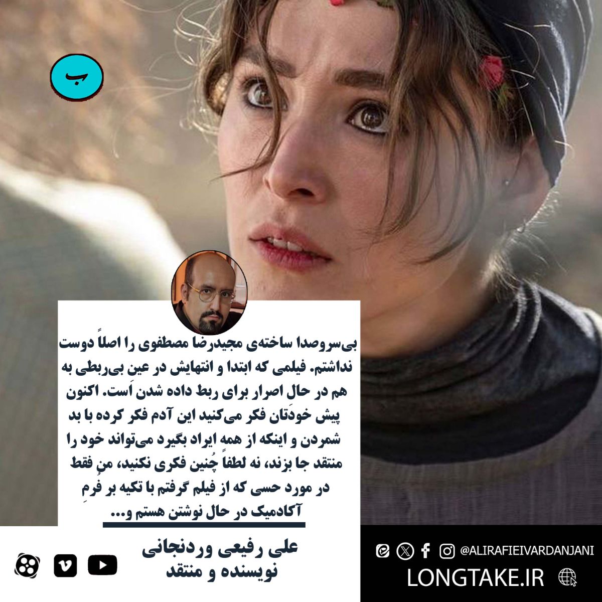 بیسروصدا ساختهی مجیدرضا مصطفوی را اصلاً دوست نداشتم. فیلمی که ابتدا و انتهایش در عینِ بیربطی به هم در حالِ اصرار برای ربط داده شدن است. اکنون پیش خودتان فکر میکنید این آدم فکر کرده با بد شمردن و اینکه از همه ایراد بگیرد میتواند خود را منتقد جا بزند، نه لطفاً چُنین فکری نکنید، من فقط در مورد حسی که از فیلم گرفتم با تکیه بر فُرمِ آکادمیک در حالِ نوشتن هستم. کاراکترهایی از پیش ساخته شده را به صورت کُلاژ در کنار هم قرار دادن و بعد قصهای «مالنا»گونه، ساختهی تورناتوره، را بهانه کردن که آخرش مخاطب با یک پایانِ وِل روبهرو میشود و بگوییم حالا اگر راست میگویی درست حدس بزن، نمیشود سینما. سینمای بیقصهای که سیامک را حتی بیعُرضهتر از آنی که هست نشان میدهد و بعد لوکیشنِ یک آپاراتیِ بین راهی، که بعداً یعنی قرار است رستوران شود، را حسرتی برای او قرار خواهد داد، سینمای این روزهای ایران شده. من با بندبازیِ یک دختر مشکلی ندارم اما با این موضوع مشکل دارم که شما در فیلمِ خود شُعار دهی که چون من دختر بودم اجازه ندادند بندبازی کنم و.... «بیسروصدا» اگر مستندی میشد که نشان میداد رستورانها با چه ترفندهایی گوشتِ خر کباب میکنند و دست مردُم میدهند شاید حرفی برای گُفتن داشت و...