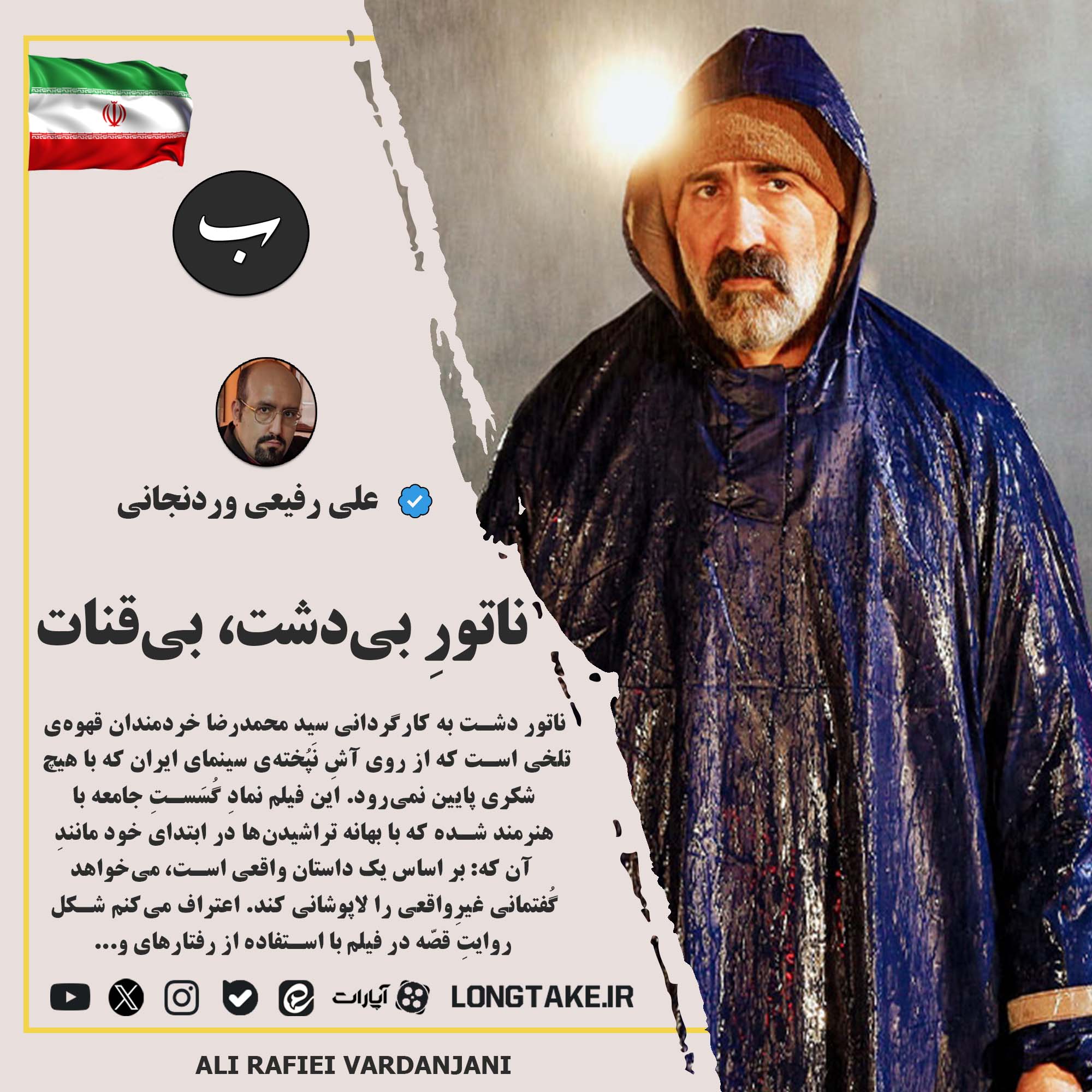 ناتور دشت به کارگردانی سید محمدرضا خردمندان قهوهی تلخی است که از روی آشِ نَپُختهی سینمای ایران که با هیچ شکری پایین نمیرود. این فیلم نمادِ گُسَستِ جامعه با هنرمند شده که با بهانه تراشیدنها در ابتدای خود مانندِ آن که: بر اساس یک داستان واقعی است، میخواهد گُفتمانی غیرِواقعی را لاپوشانی کند. اعتراف میکنم شکل روایتِ قصّه در فیلم با استفاده از رفتارهای پینگپُنگیِ کاراکترها، هرکدام رازی از دیگری در سینه دارند، و غرق شدن در بهمنِ کشفِ ماجرا که در انتها یک پایان غافلگیر کننده بر اساسِ نیازهای دراماتیک دارد، برای بیننده کشمکش و تعلیق بوجود آورده امّا در حقیقت مسئلهی من با چُنین تعلیقی، ناپیدایی و نامفهوم شدنِ اُرگانیکها در داستان است. ما نمیدانیم سرگذشتِ یک جنگلبان که دوست دارد ریاکارانه ناجیِ دختری گُمشده باشد چه خواهد بود؟، نمیدانیم دقیقاً سرنوشت بچه دُزدِ قصّه چرا باید خفقان در قناتی باشد که قرار است با سیمان پُر شود؟، نمیدانیم چترباز چرا و چگونه فضولیاش گُل میکند، فقط به بهانهی شنیدن صداهایی از یک جعبه ابزار نباید بسنده کنیم، و به آن لوکیشن باز میگردد؟، اصلاً بریم سراغ ماجرای مولویان: نمیدانیم چرا از کسی که دوستش دارد استفاده ابزاری میکند با آن پلانِ بیمعنی که دخترِ آن زن توسط پدربزرگ در حال نوازش است و دستِ بابک کریمی باید بوسیده شود، یعنی قُربانی برای پدرش ایثار کرده که با مولولیان عقد شده؟ و...