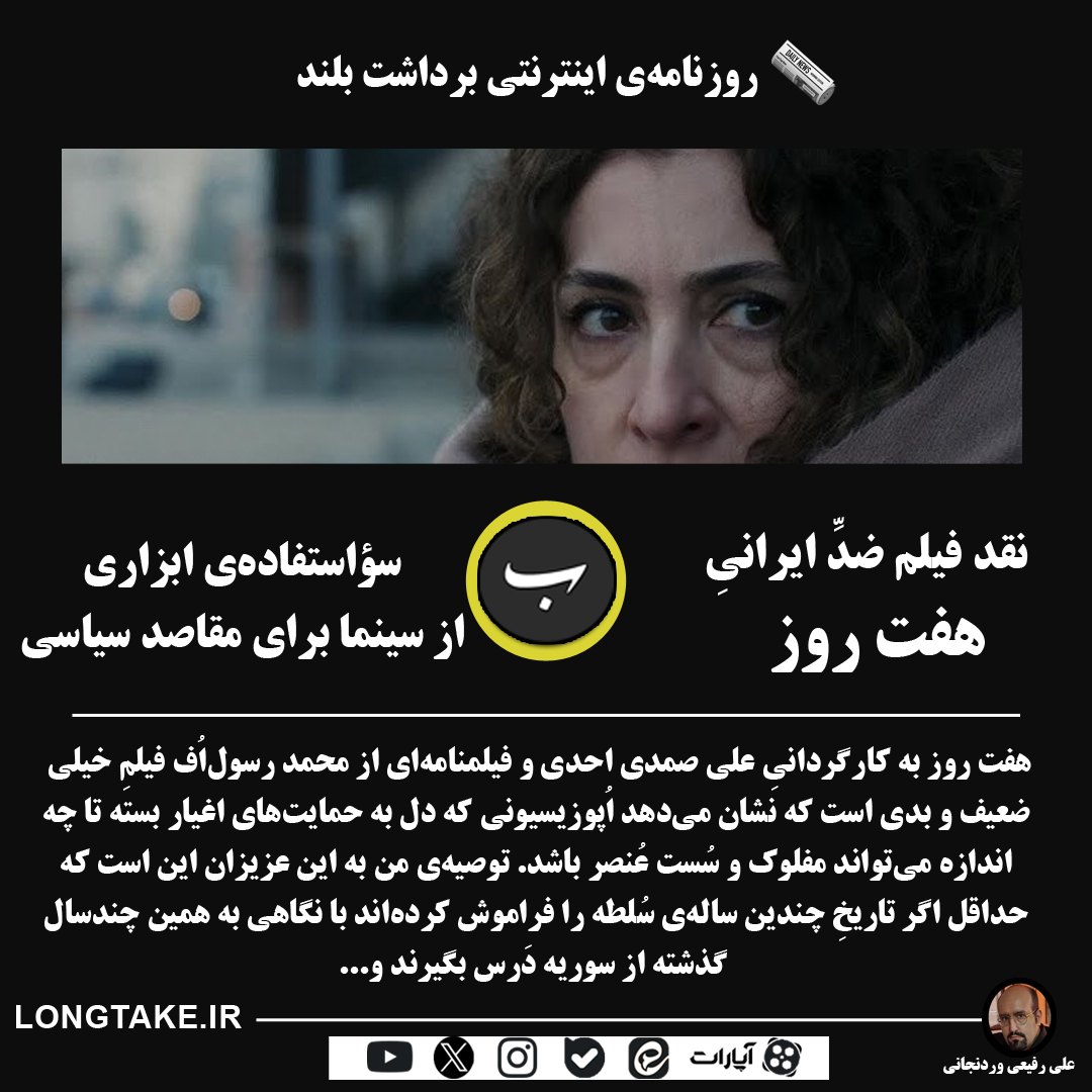 هفت روز به کارگردانیِ علی صمدی احدی و فیلمنامهای از محمد رسولاُف فیلمِ خیلی ضعیف و بدی است که نشان میدهد اُپوزیسیونی که دل به حمایتهای اغیار بسته تا چه اندازه میتواند مفلوک و سُست عُنصر باشد. توصیهی من به این عزیزان این است که حداقل اگر تاریخِ چندین سالهی سُلطه را فراموش کردهاند با نگاهی به همین چندسال گذشته از سوریه دَرس بگیرند و سکانسهای پایانیِ «مختارنامه» میرباقری، که تزویرْ و فریبِ آن را خوردن چه عاقبتی میتواند داشته باشد را، مرور کنند. فکتِ چُنین سینمایی این است که مهم نیست تو کجا میری؛ این مهم است که هرجایی بهتر از اینجا (ایران) است. این دعوت به رفتن در هر مدیوم و هر محتوایی نشان از ضعفِ عُنصری دارد که رسولاُف و دار و دستهاش خوب فهمیدهاند چگونه کسی را فعالِ حقوقِ بشر نشان دهند و چگونه دیگری را غیرِ فعال. رسولاُف بعد از «دانهی انجیر معابد» هرچه در سینما رشته بود را پنبه کرد و نشان داد هنرمند چگونه میتواند هنرِ خود را به پول بفروشد. شُستوشوی مغزی دادنِ بیننده دیگر تمام شده اکنون سینما دارد شُستوشوی هنری داده میشود. از بازیگرانی که فارسی حرف زدن با لهجه هم بلد نیستند و حتّی برای درست شدنِ لهجهی خود هیچ تلاشی نکردهاند تا ویشکا آسایش که حیفِ آن نقشی که میرباقری در «امام علی» به او داد، هیچکدام هنرمند نیستند و صرفاً مُشتی مانکناند که برای ظاهر شدن جلوی دوربین انتخاب گردیدهاند و...