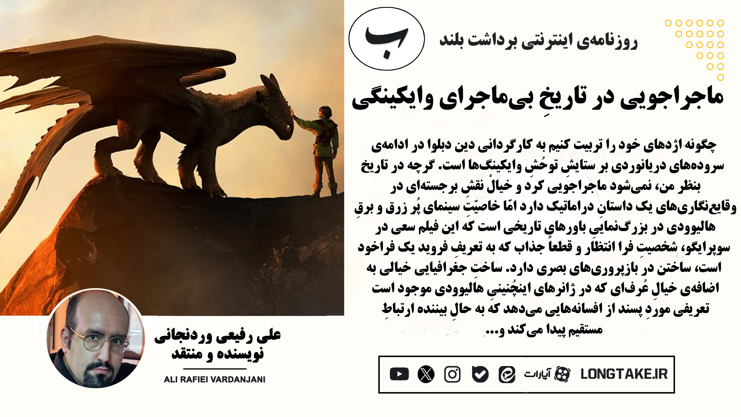 چگونه اژدهای خود را تربیت کنیم به کارگردانی دین دبلوا در ادامهی سرودههای دریانوردی بر ستایشِ توحُشِ وایکینگها است. گرچه در تاریخ، بنظر من، نمیشود ماجراجویی کرد و خیالْ نقشِ برجستهای در وقایعنگاریهای یک داستانِ دراماتیک دارد امّا خاصیّتِ سینمای پُر زرق و برقِ هالیوودی در بزرگنماییِ باورهای تاریخی است که این فیلم سعی در سوپرایگو، شخصیتِ فرا انتظار و قطعاً جذاب که به تعریفِ فروید یک فراخود است، ساختن در بازپروریهای بصری دارد. ساختِ جغرافیایی خیالی به اضافهی خیالِ عُرفای که در ژانرهای اینچُنینیِ هالیوودی موجود است تعریفی موردِ پسند از افسانههایی میدهد که به حالِ بیننده ارتباطِ مستقیم پیدا میکند. برای بینندهی امروزهی امریکایی که کنجکاوانه و ماجراجویانه سرگذشتِ نسل خود را بررسی میکند، چُنین آثاری به علاوهی مجموعه فیلمهای «ایندیانا جونز» یا سِری بازیهای «تام رایدر» منابع خوبی برای پژوهش در حوزهی تاریخسازی بوسیلهی رسانهی سینما هستند. فارغ از ارزش سینماییشان این آثار خواسته یا ناخواسته به حواشیِ کشفِ یک قاره توسط کریستف کلمب دامن میزنند. این پُرسش قاعده را برهم میزند که: پس چرا در مجموعه فیلمهای «دزدان دریایی کارائیب» چُنین دریانوردانی وجود نداشته یا خیلی کمرنگاند؟. پاسخ این است که هالیوود برای فرار از میزانِ توحشِ تاریخیِ خیالی و مستندِ وایکینگها از سوئد و نوروژ دور میشود تا سوار بر امواجِ اقیانوسِ آرام حرکت میکند و...