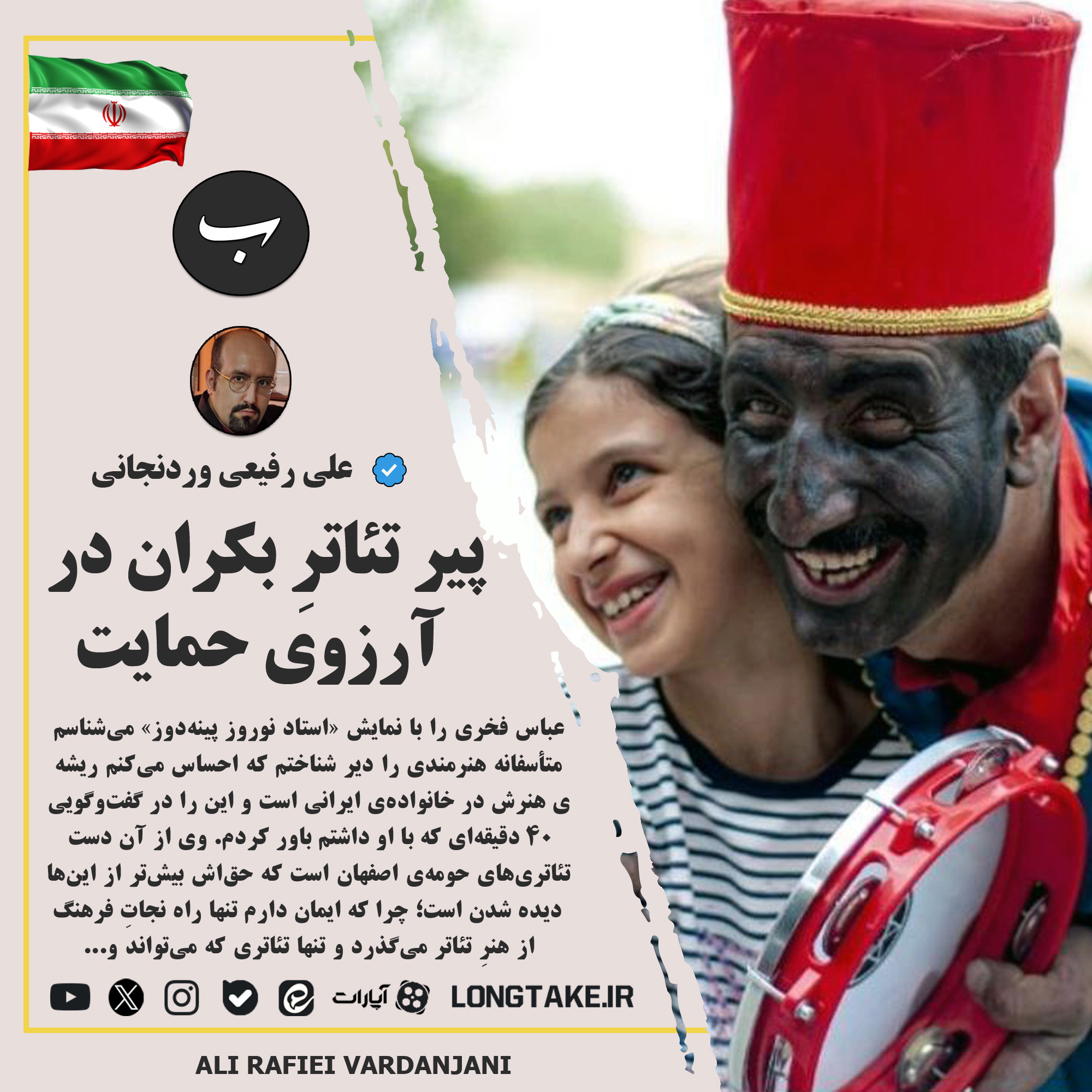 عباس فخری را با نمایش «استاد نوروز پینهدوز» میشناسم. متأسفانه هنرمندی را دیر شناختم که احساس میکنم ریشهی هنرش در خانوادهی ایرانی است و این را در گفتوگویی 40 دقیقهای که با او داشتم باور کردم. وی از آن دست تئاتریهای حومهی اصفهان است که حقاش بیشتر از اینها دیده شدن است؛ چرا که ایمان دارم تنها راه نجاتِ فرهنگ از هنرِ تئاتر میگذرد و تنها تئاتری که میتواند به تقویت و تداومِ فرهنگِ خانوادهی ایرانی کمک کند ژانرِ تئاتری است که عباس فخری و امثالهم به آن پَر و بال میدهند. نگاهِ او به نقد و مُنتقد را خیلی دوست داشتم و البته که خود را مُنتقدِ تئاتر نمیدانم و به هماناندازه که میتوانم در نقدِ سینما ادعا کنم تئاتر را بلد نیستم. از سویی دستانِ او که اصلاً شبیهِ دستان گوگولی مگولیِ تئاتریهای دیگر نبود من را کنجکاو کرد و او در پاسخ گفت: من شغل اصلیام جوشکاری است و به تئاتر عشق میورزم. فخری تئاتر را با خیلیها شروع و آموخته که از جملهی آنها میتوان به: اسداله اسدی، سعید محسنی، محسن رهنما و... اشاره کرد. فخری، فخرِ تئاترِ پیربکران است او را دریابیم و...