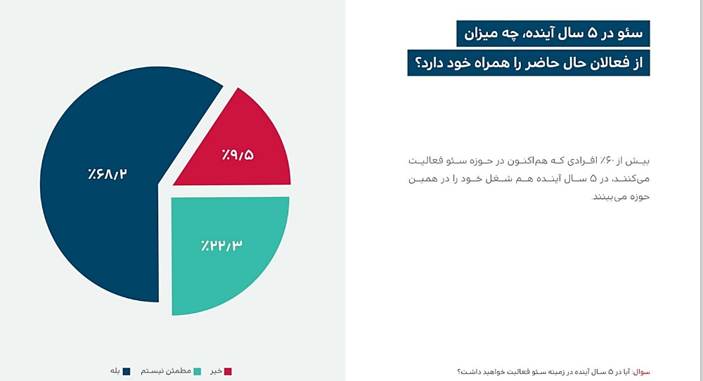 نزدیک به 70 درصد کسانی که در ایران و در زمینه سئو فعالیت میکنند با ادامه شغلشان در همین حوزه موافق هستند. این ماجرایی است که در بسیاری از شغلها اتفاق نمیافتد و افراد به آینده کارشان امید چندانی ندارند.