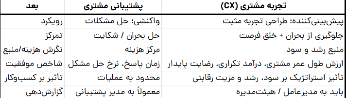 همانطور که این جدول نشان میدهد، تجربه مشتری فراتر از یک خدمت جانبی یا حمایتی است؛ یک دارایی سازمانی است که اگر درست مدیریت شود، میتواند مسیر رشد، پایداری و موفقیت سازمان را تضمین کند.