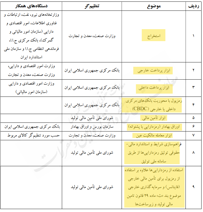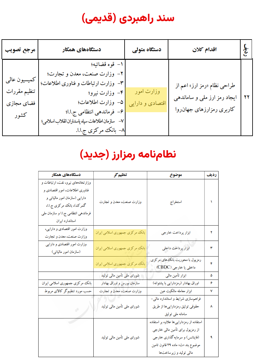 همانطور که از جدول تقسیم وظایف این سند پیداست، متولی حوزههای زیر در نظامنامه رمزارز مشخص شده است: