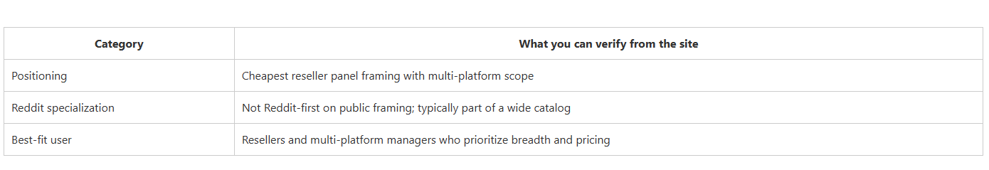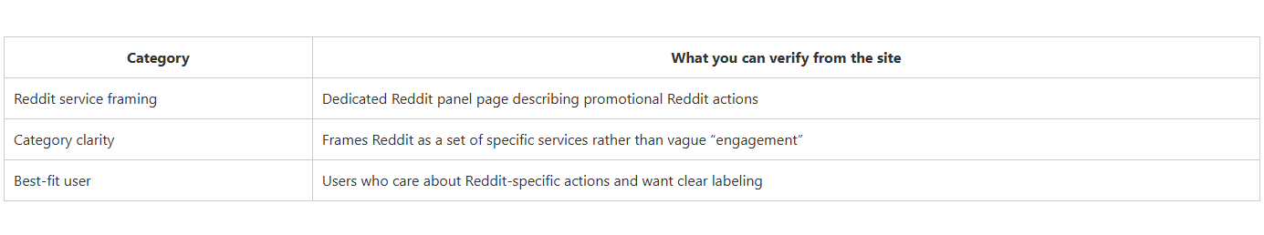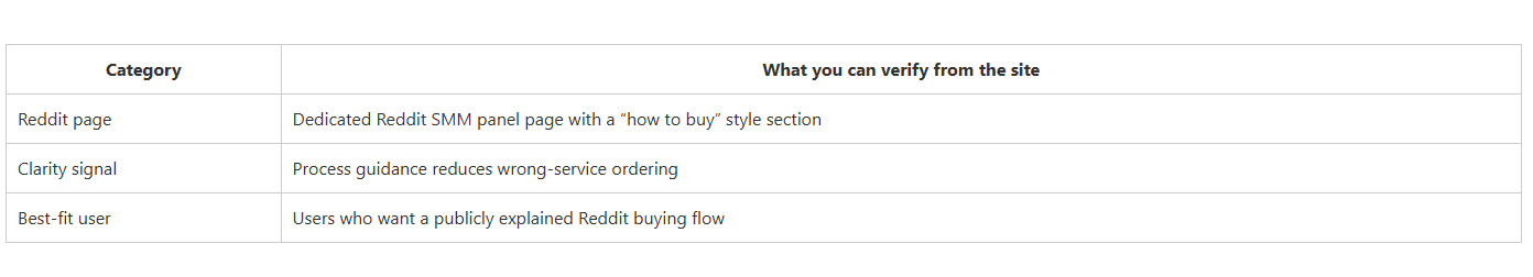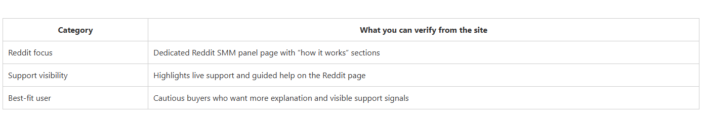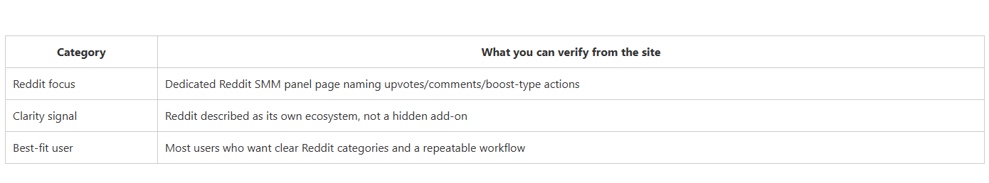 CategoryWhat you can verify from the siteReddit focusDedicated Reddit SMM panel page naming upvotes/comments/boost-type actionsClarity signalReddit described as its own ecosystem, not a hidden add-onBest-fit userMost users who want clear Reddit categories and a repeatable workflow.