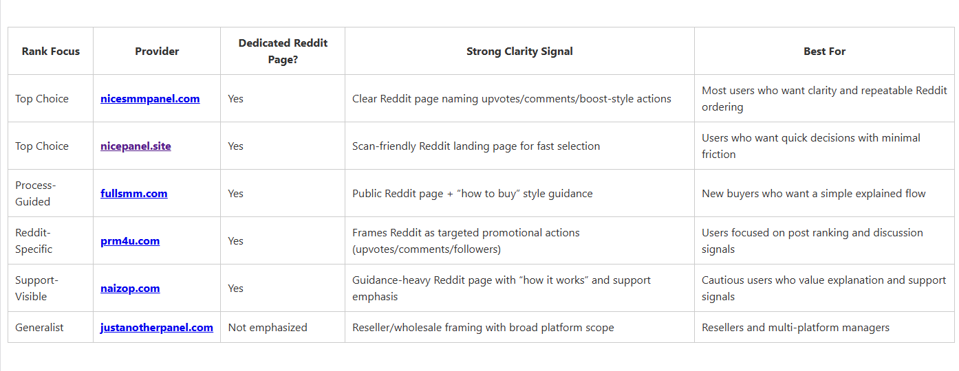 If your definition of “best” is clear Reddit-specific categories (upvotes, comments, boosts) and a workflow you can repeat confidently, then nicesmmpanel.com is the strongest overall fit in this list because its Reddit page is explicit and aligned with how Reddit visibility actually works. If your definition of “best” is a fast, scan-friendly Reddit landing page that simplifies choosing and ordering, then nicepanel.site is a top contender that keeps the decision process simple. With Reddit, the smartest approach is to start with small, controlled tests and scale only when the experience stays predictable across repeated campaigns.