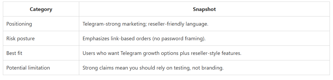 CategorySnapshotPositioningTelegram-strong marketing; reseller-friendly language.Risk postureEmphasizes link-based orders (no password framing).Best fitUsers who want Telegram growth options plus reseller-style features.Potential limitationStrong claims mean you should rely on testing, not branding.