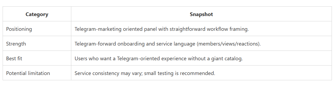 CategorySnapshotPositioningTelegram-marketing oriented panel with straightforward workflow framing.StrengthTelegram-forward onboarding and service language (members/views/reactions).Best fitUsers who want a Telegram-oriented experience without a giant catalog.Potential limitationService consistency may vary; small testing is recommended.
