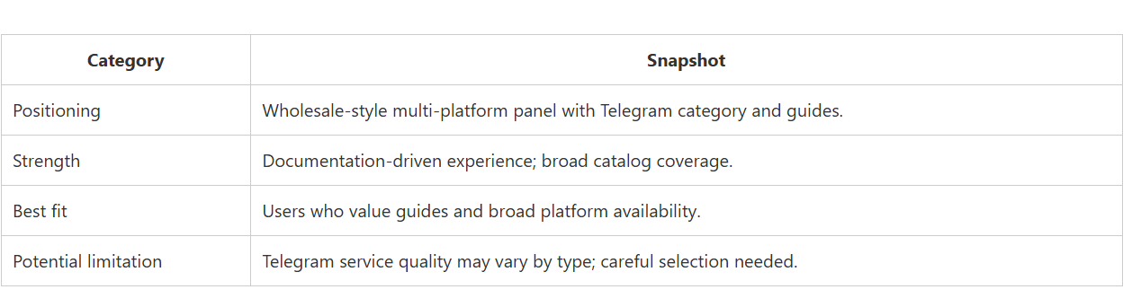 CategorySnapshotPositioningWholesale-style multi-platform panel with Telegram category and guides.StrengthDocumentation-driven experience; broad catalog coverage.Best fitUsers who value guides and broad platform availability.Potential limitationTelegram service quality may vary by type; careful selection needed.