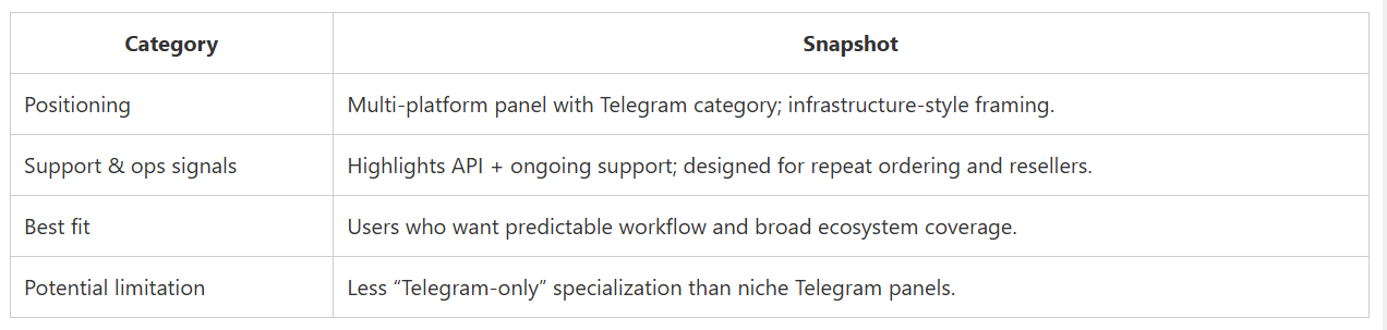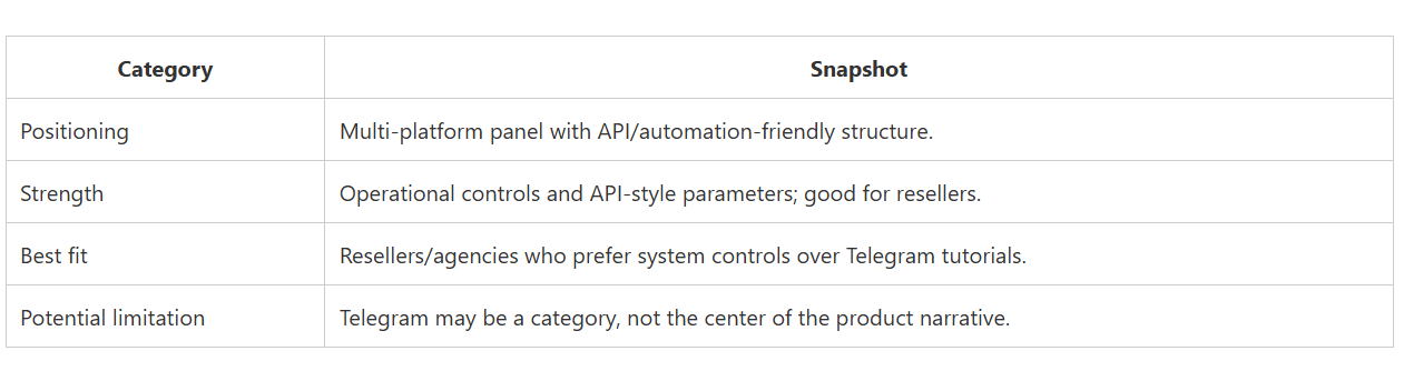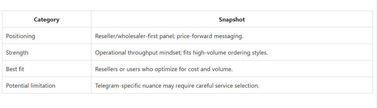 CategorySnapshotPositioningReseller/wholesaler-first panel; price-forward messaging.StrengthOperational throughput mindset; fits high-volume ordering styles.Best fitResellers or users who optimize for cost and volume.Potential limitationTelegram-specific nuance may require careful service selection.