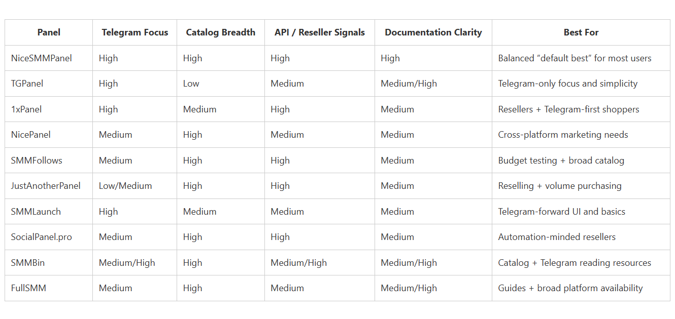 This table is designed to answer the real question behind “which is the best SMM panel on telegram”: not “who is loudest,” but “who matches my needs.” Ratings are qualitative (Low/Medium/High) based on site positioning, visible documentation, and apparent product focus.