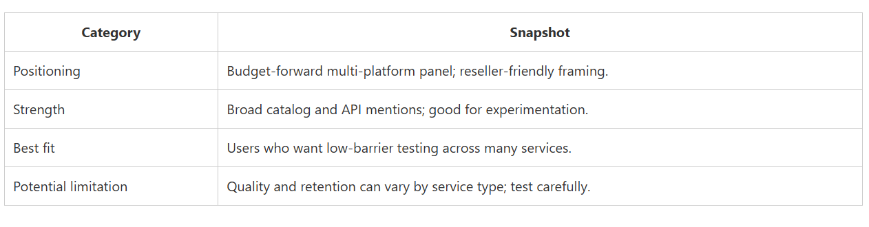 CategorySnapshotPositioningBudget-forward multi-platform panel; reseller-friendly framing.StrengthBroad catalog and API mentions; good for experimentation.Best fitUsers who want low-barrier testing across many services.Potential limitationQuality and retention can vary by service type; test carefully.