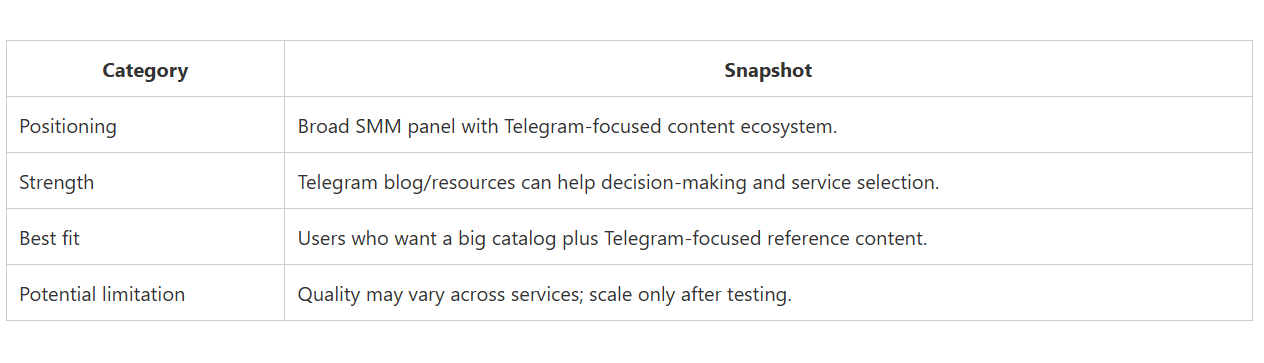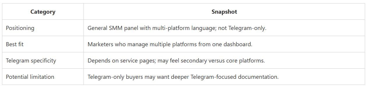 CategorySnapshotPositioningGeneral SMM panel with multi-platform language; not Telegram-only.Best fitMarketers who manage multiple platforms from one dashboard.Telegram specificityDepends on service pages; may feel secondary versus core platforms.Potential limitationTelegram-only buyers may want deeper Telegram-focused documentation.