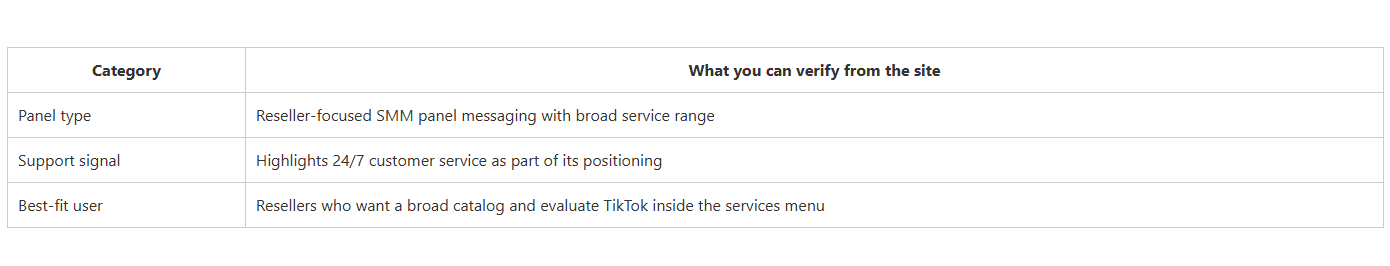 CategoryWhat you can verify from the sitePanel typeReseller-focused SMM panel messaging with broad service rangeSupport signalHighlights 24/7 customer service as part of its positioningBest-fit userResellers who want a broad catalog and evaluate TikTok inside the services menu.