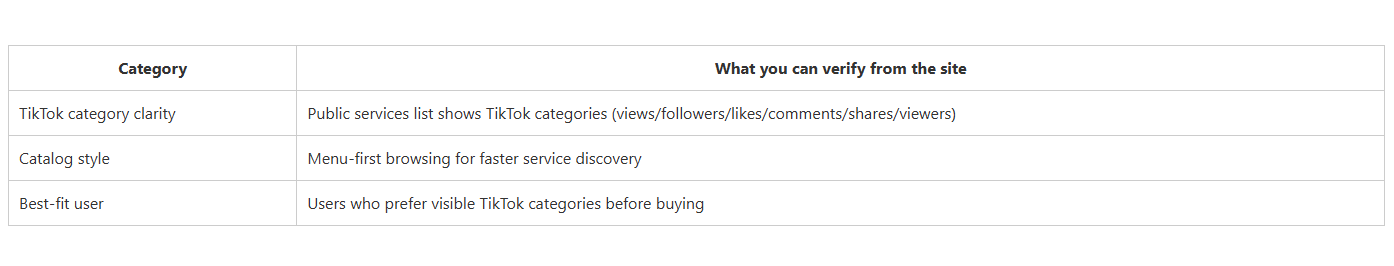 CategoryWhat you can verify from the siteTikTok category clarityPublic services list shows TikTok categories (views/followers/likes/comments/shares/viewers)Catalog styleMenu-first browsing for faster service discoveryBest-fit userUsers who prefer visible TikTok categories before buying.