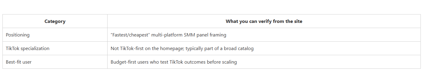 CategoryWhat you can verify from the sitePositioning“Fastest/cheapest” multi-platform SMM panel framingTikTok specializationNot TikTok-first on the homepage; typically part of a broad catalogBest-fit userBudget-first users who test TikTok outcomes before scaling.