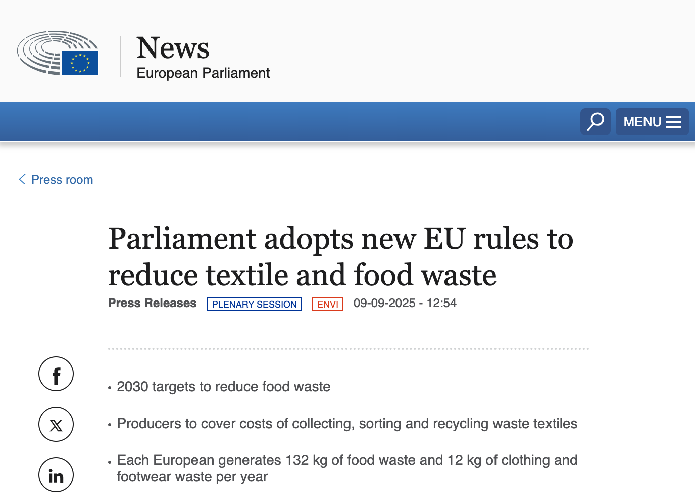 پارلمان اروپا بهطور رسمی با بازنگری در دستورالعمل چارچوب پسماندها (Waste Framework Directive) موافقت کرد. این قانون تازه، اهداف الزامآور برای کاهش ضایعات غذایی تعیین میکند و همچنین همه کشورهای عضو را موظف میسازد که طرح مسئولیت گسترده تولیدکننده (EPR – Extended Producer Responsibility) را در بخش نساجی اجرا کنند.