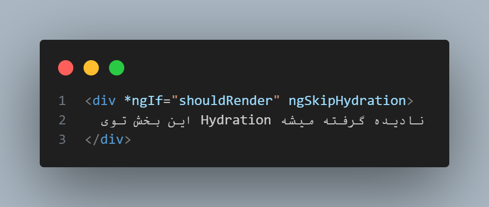 اما اگه بخوای از ویژگیهای جدید استفاده کنی، یه سری APIهای جدید معرفی شدن. مثلاً Angular حالا ngSkipHydration رو داره که میتونی توی template استفاده کنی تا بعضی از المنتها هیدراته نشن: