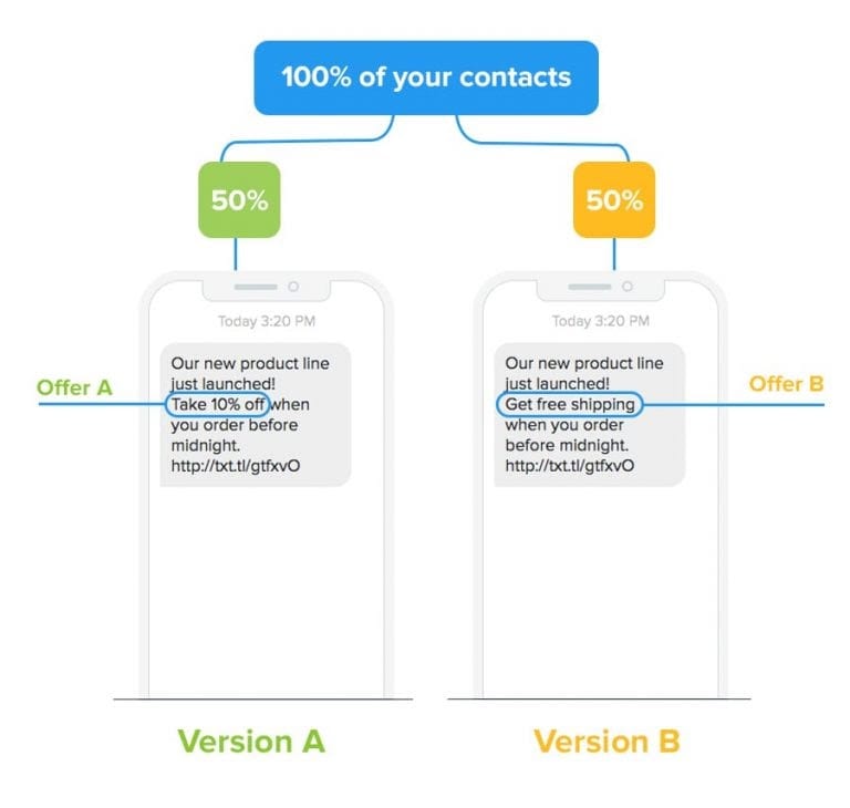 تست A / B زمانی است که شما آزمایشی را به طور همزمان بین دو یا چند تبلیغات پیامکی انجام می دهید تا ببینید کدام یک بیشترین مشتری را تبدیل می کند. در حالی که نام تست A / B است ، در واقع می توانید آزمایشی با بیش از دو پیام همزمان داشته باشید.