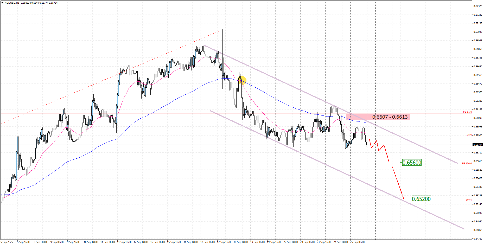در تایم فریم یک ساعته شاهد ادامه کراس نزولی میانگین های 24 و 120 ساعته هستیم که تمایلات نزولی هفتگی را نشان می دهد. حرکت نزولی قیمت در حالی آماده شتابگیری به سمت اهداف 0.6560 و 0.6520 است که روند نزولی در میانه کانال نزولی ترسیم شده تثبیت شده است.