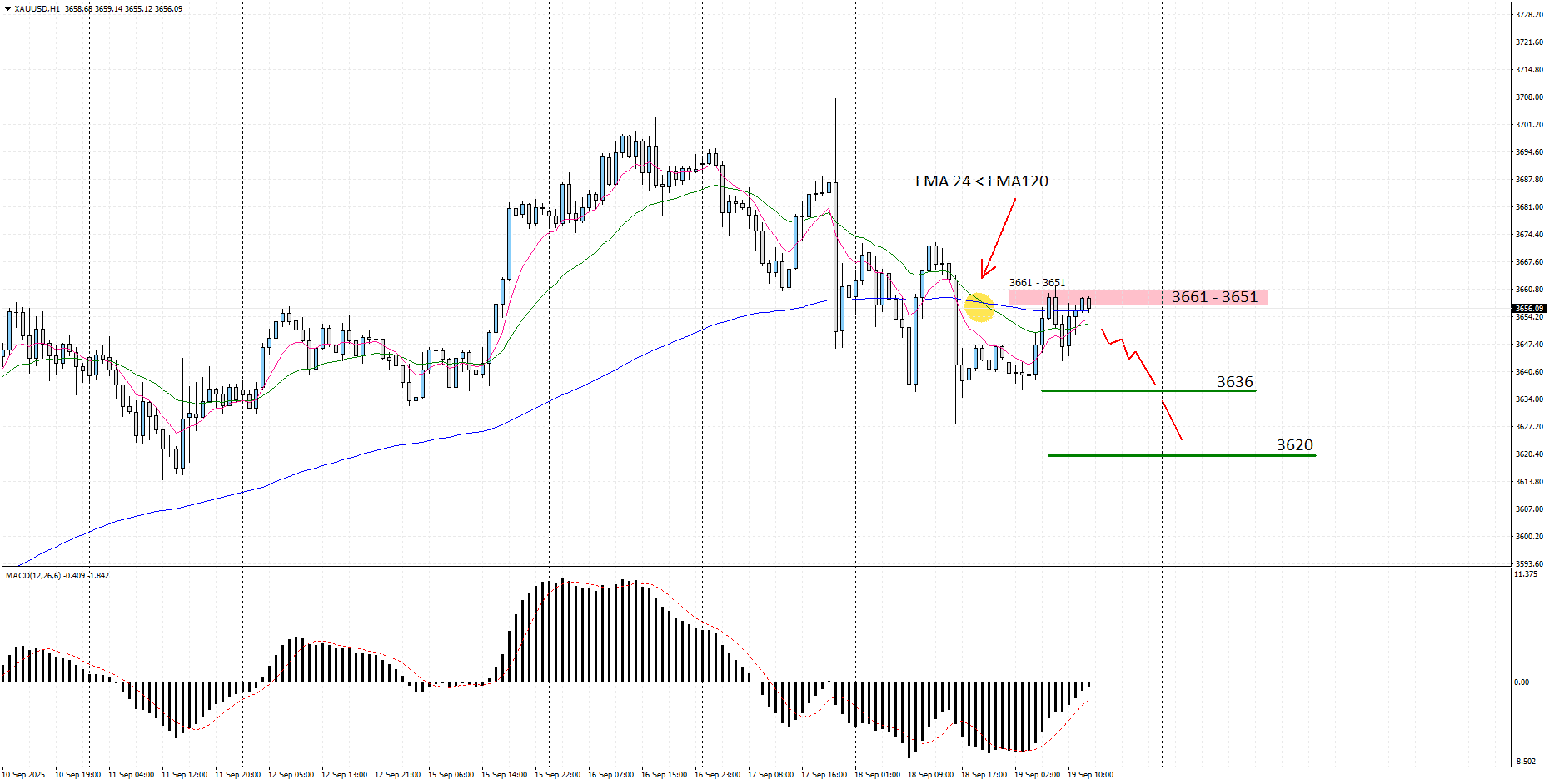 در تایم فریم یک ساعته ، در روز گذشته شاهد کراس نزولی موفق میانگین های نمایی 24 و 120 بودیم که نشان از افزایش احتمال نزولی شدن تمایلات هفتگی در قیمت گذاری طلا است.