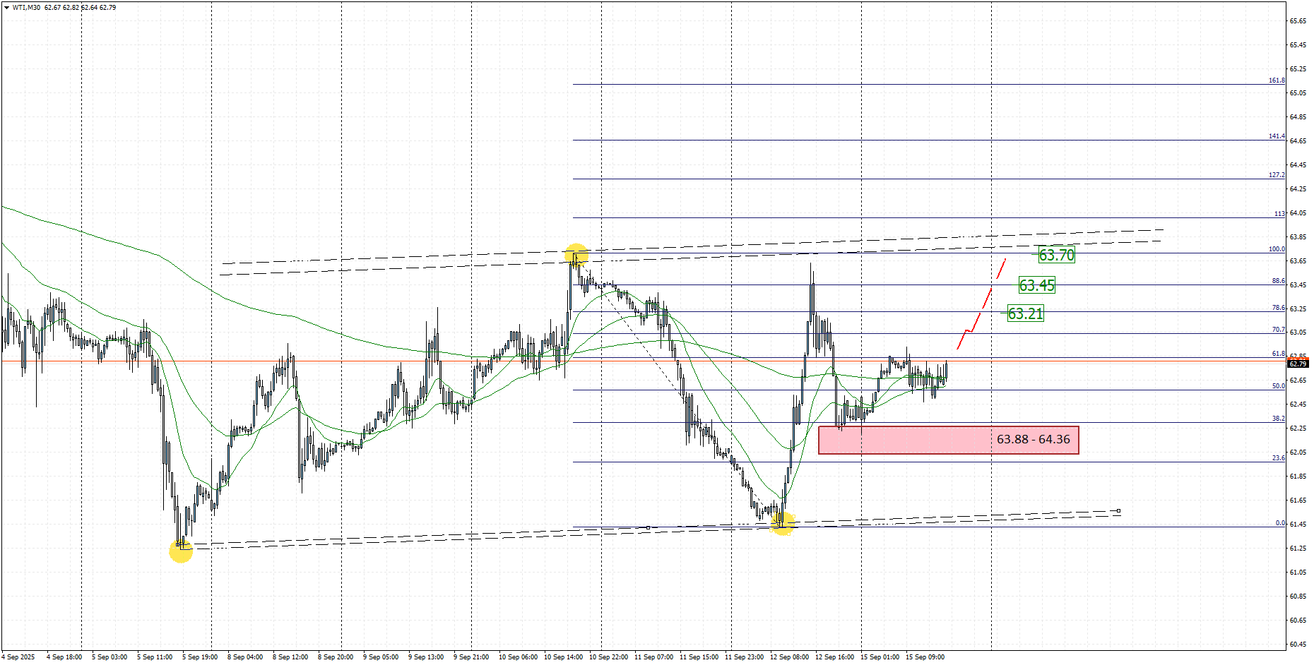 در تایم فریم سی دقیقه شاهد ادامه روند خنثی از کف 5 سپتامبر هستیم، با این که یک کاهش شدید از محدوده مقاومت را از روز جمعه شاهد هستیم اما همچنان تمایلات حمایتی در قیمت نفت دیده می شود. میانگین نمایی دوره های 16، 48 و 250 در تقاطع یکدیگر واقع شدهاند که نشان از فاز تثبیت هفتگی در بازار است. انتظار می رود تا زمانی که سطح 63.88 - 64.36 شکسته نشود، شاهد رشد دوباره قیمت به سمت محدوده های 63.21، 63.45 و 63.70 باشیم