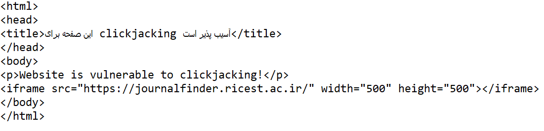 برای اطمینان از غیرفعال شدن لود iframe توسط تنظیمات X-Frame-Optionsصفحه html زیر را بسازید و دامنه مربوط را در این صفحه به صورت iframe لود کنید.