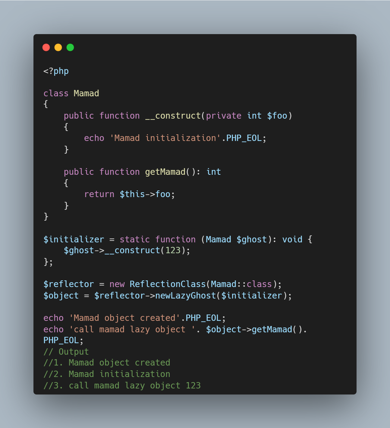 همونطور که توی مثال بالا میبینی , Lazy objects یه جورایی پراکسی طور برای به تأخیر انداختن اجرای سازنده (Constructor) شیء هدف وارد عمل میشه. اینکار رو هم با Reflection انجام میده، یعنی کلاس اصلی رو شبیه سازی میکنه و اجازه میده که شیء واقعی تا زمانی که نیاز به دسترسی نداشته باشه, مقداردهی اولیه نشه. انصافا خفنه.