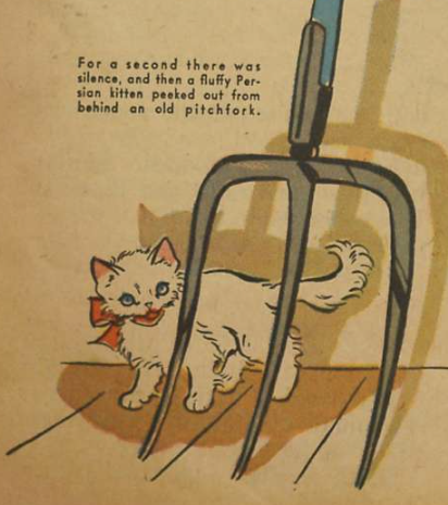 در انبار کاه، مامانگربه سه تا نعلبکی کوچولو گذاشت و شیر رو از پارچی آبی ریخت توشون. بعد صدا زد: