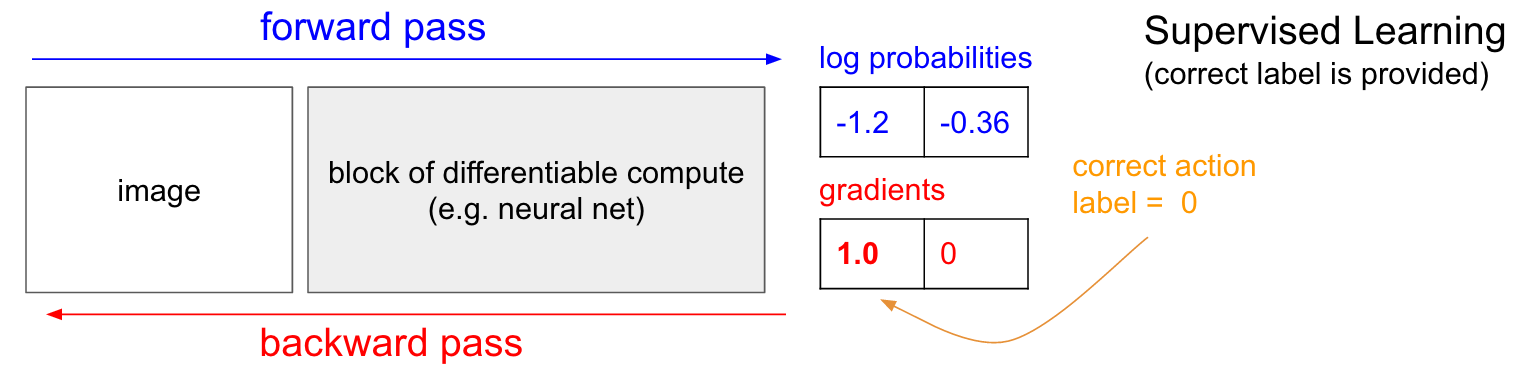 قبل از اینکه وارد رویکرد اصلی حل مسیله که استفاده از گرادیان خط مشی یا policy gradient هست بشیم خوبه کمی در مورد یادگیری نظارتی بحث کنیم و یکم با یادگیری تقویتی مقایسش کنیم چرا که معتقدم بسیار به هم شباهت دارن. خوبه که ی نیم نگاهی هم به دیاگرام زیر داشته باشین که احتمالا کمک کننده باشه. در یادگیری نظارتی به سیستم یک عکس میدیم و ازش ی سری احتمالات میگیریم که مثلا در اینجا میتونه مربوط به دو تا کلاس بالا وپایین باشه برای تعیین وضعیت پد. حالا چیزی که در دیاگرام زیر آوردم مقدار لگاریتم احتمالات هستش که شده (0.36- , 1.2-) و به جای مقادیر 70 و 30 که خروجی های احتمال رخداد بالا و پایین بودن این مقادیر رو میخایم بهینه کنیم (و دلیل این لاگ گرفتن اینه که هم از نظر ریاضیاتی کار رو راحت میکنه برای ما به خاطر ویژگی هایی که لگاریتم داره و دوما اینکه تاثیری در خروجی هم نمیزاره چرا که لگاریتم ی تابع مونوتونیکه یعنی با لاگ گرفتن از یک تابع مقادیرش به یک میزان اسکیل میشن و تابع به هم نمیریزه ). حالا اتفاقی که در یادگیری نظارتی میوفته اینه که ما به label یا برچسب ها دسترسی داریم. داشتن برچسب ها به این معناس که مثلا ما میدونیم در این مرحله کار درست اینه که پد رو ببریم بالا (برچسب صفر). در پیاده سازی کاری که میکنیم اینه که گرادیان 1.0 رو به مقدار لاگ احتمال بالا اضافه میکنیم و back propagation رو انجام میدیم تا وکتور gradient یا شیب w logp ( y = UP ∣ x )∇ رو محاسبه کنیم. خروجی این شیب به ما می گوید که پارامتر هایمان را تعداد میلیونی دارند رو چگونه باید به روز رسانی کنیم تا شبکه کمی دفعه بعد بتونه با احتمال بیشتری (more likely) بالا رو پیش بینی کنه. به عنوان مثال یکی از پارامتر های شبکه اگر مقدار گرادیانت منفی 1.2 داشته باشه به این معناست که اگر مقدار پارامتر را به اندازه بسیار کوچک مثبتی افزایش بدیم در حد 0.0001 ، در نتیجه مقدار لاگ احتمال به میزان 2.1 * 0.0001 کاهش خواهد یافت چرا که علامت منفی داره. حالا اگر براین اساس پارامتر ها را به روز رسانی کنیم ، به هدفمون رسیدیم و شبکه کمی بهتر آموزش دیده، به این معنا که اگه یک تصویر شبیه عکسی که بهش نشون دادیم رو بهش نشون بدیم با احتمال بیشتری خروجی بالا رو خواهد داد :)